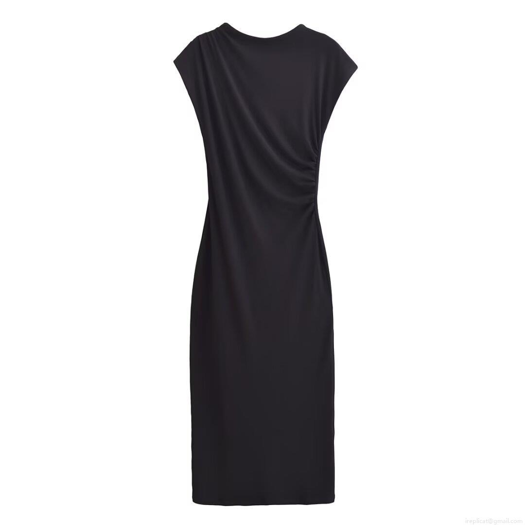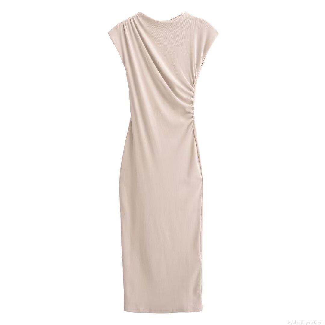 • Women's Sexy Ruched Sleeveless Midi Dress Round Neck Slim Fit Ribbed Knit Bodycon Dress Solid Color Side Pleated Streetwear Long Sundress