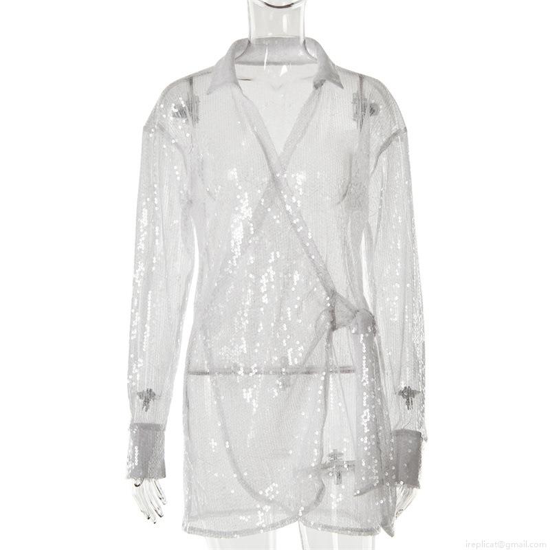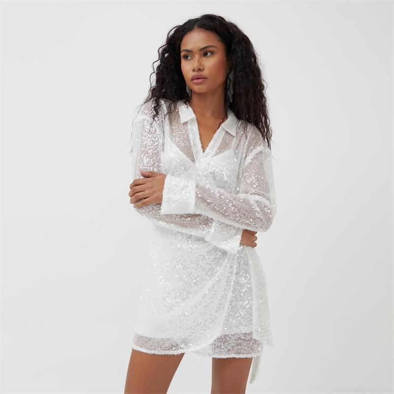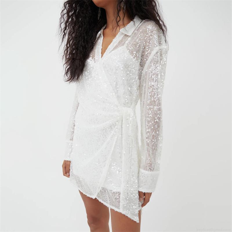 • Women's Sexy White Sequin Mesh Dress Fashion V-Neck Long Sleeve Wrap Mini Dress Elegant Party Club Night Out Cocktail Dress
