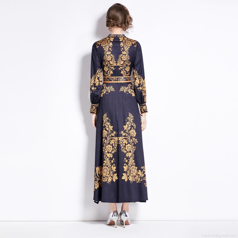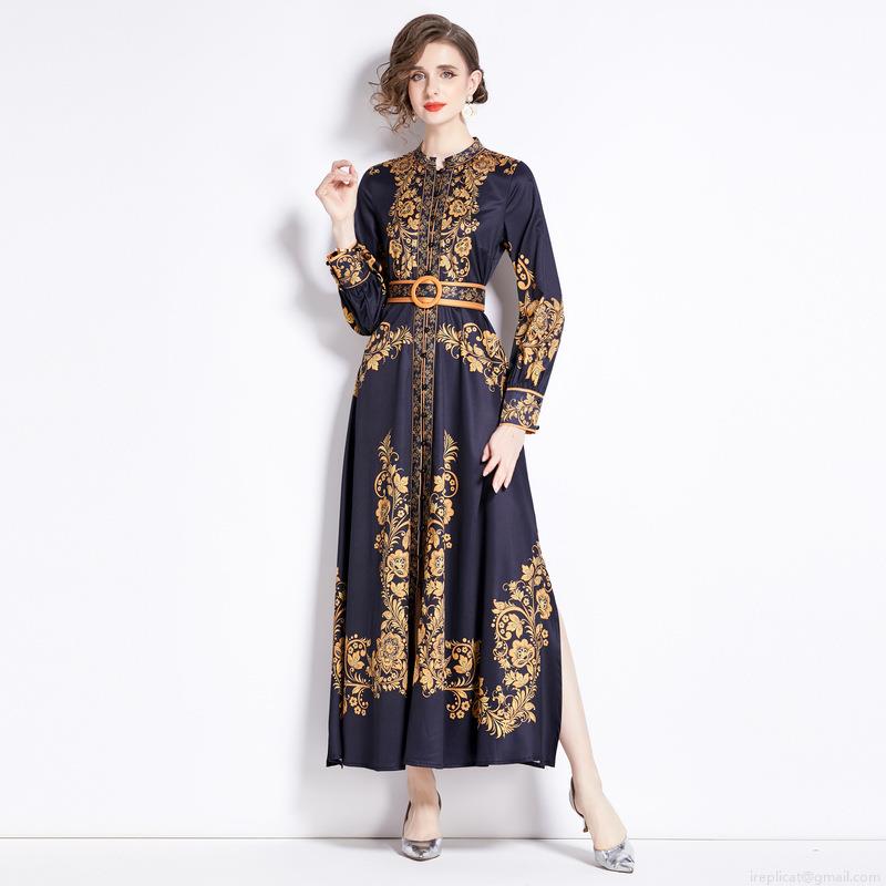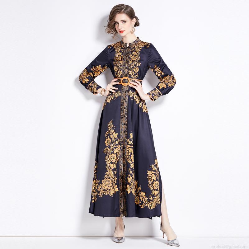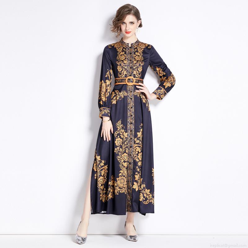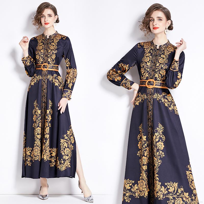 • Women's Vintage Baroque Floral Print Maxi Dress Elegant Stand Collar Long Sleeve Button Up Split A-Line Long Dress With Waist Belt For Office Party Autumn Winter