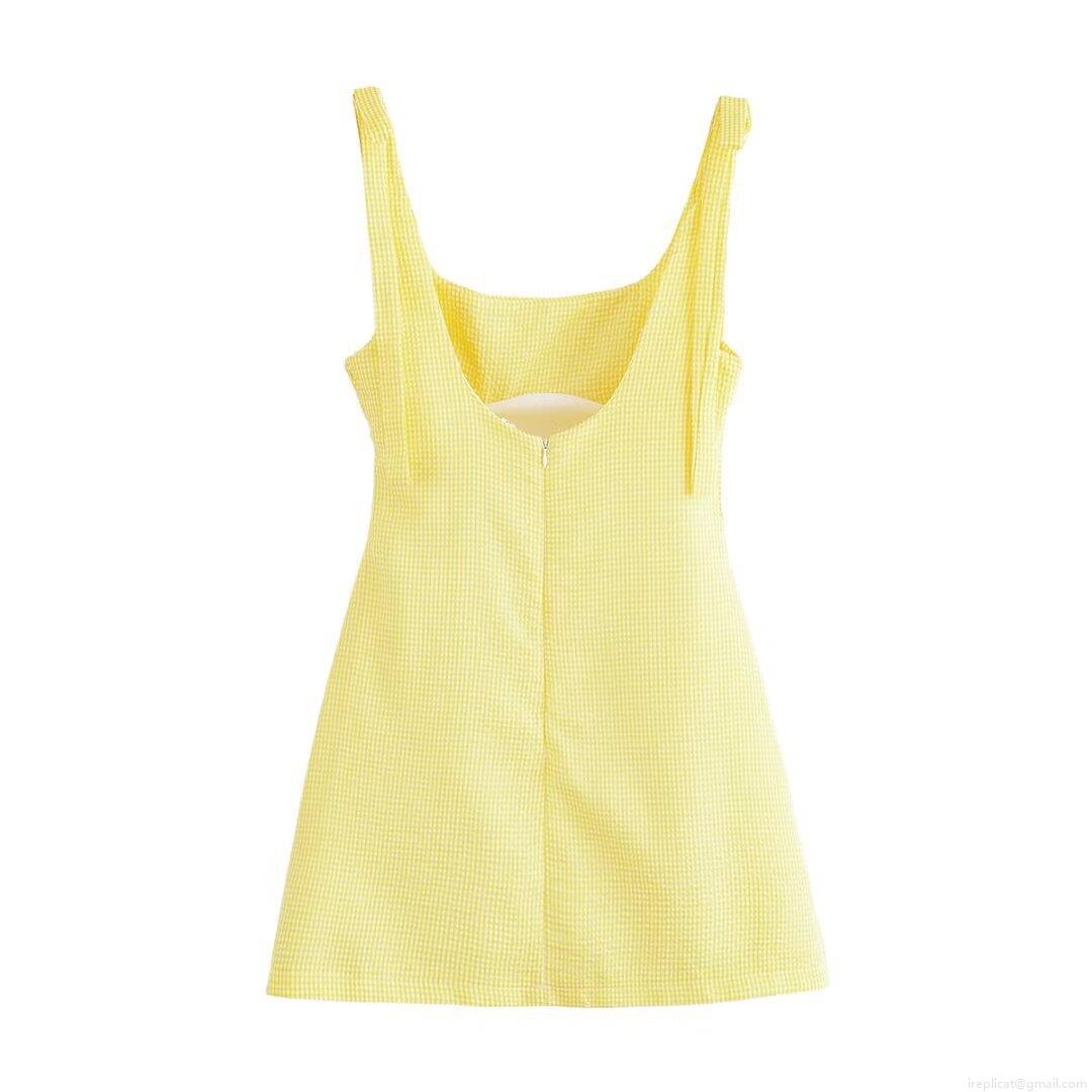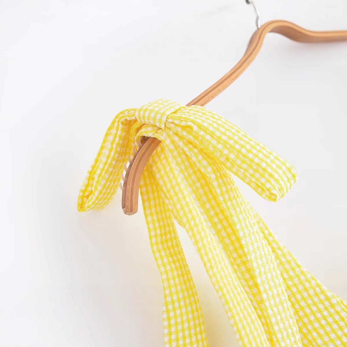 • Women's Yellow Gingham Plaid Strap Mini Dress Bow Tie Shoulder Square Neck Backless Sleeveless Summer Party Vacation Sundress Polyester Slim Fit
