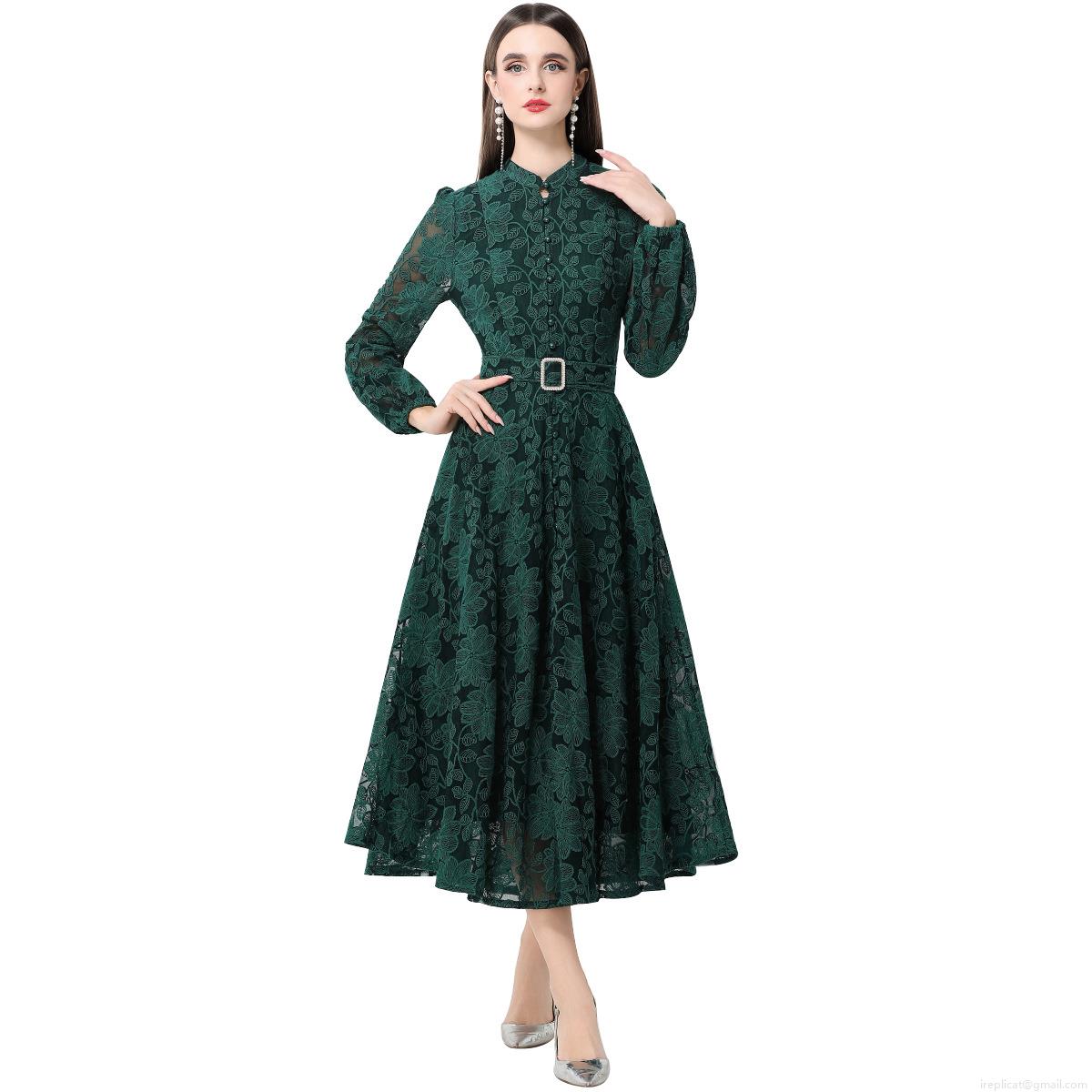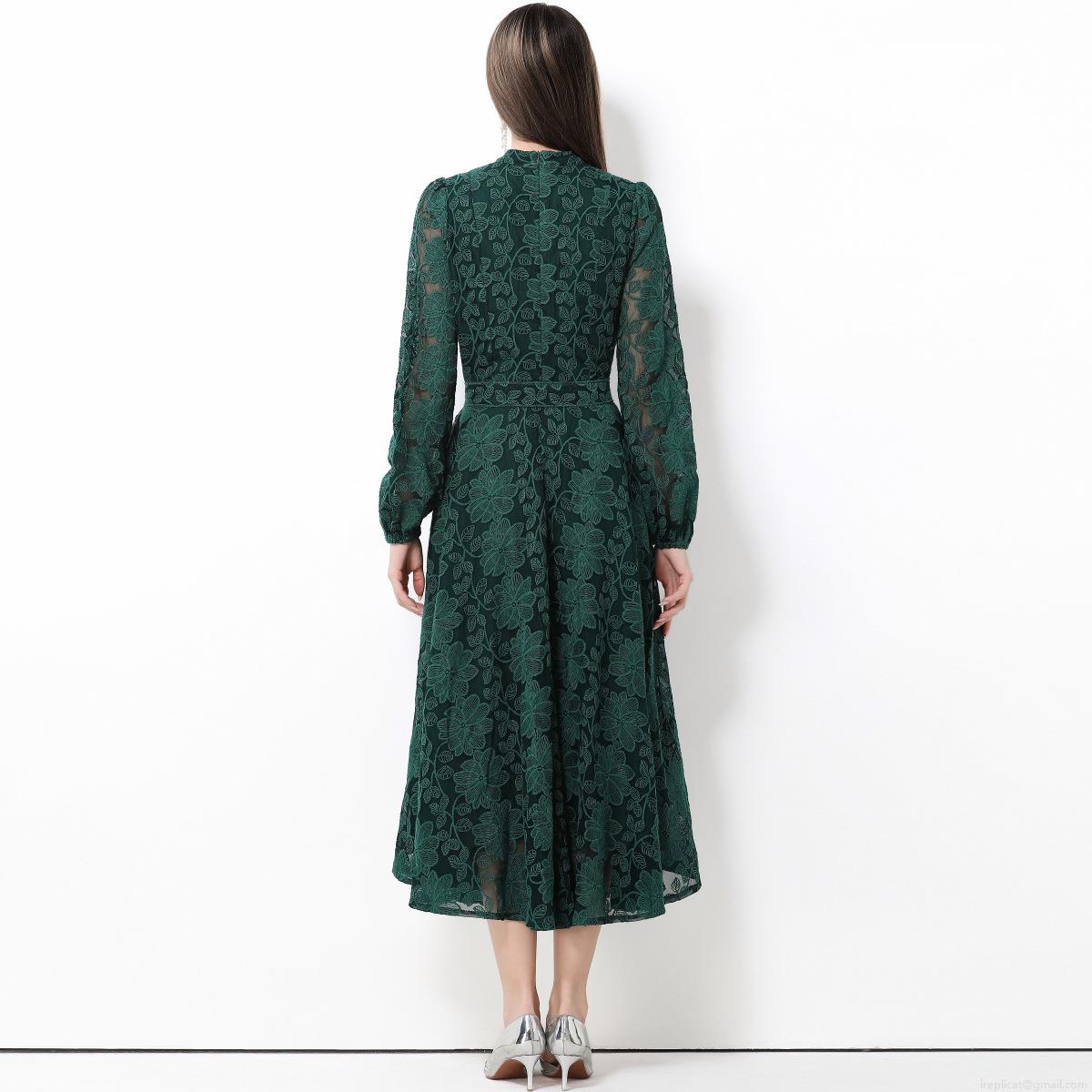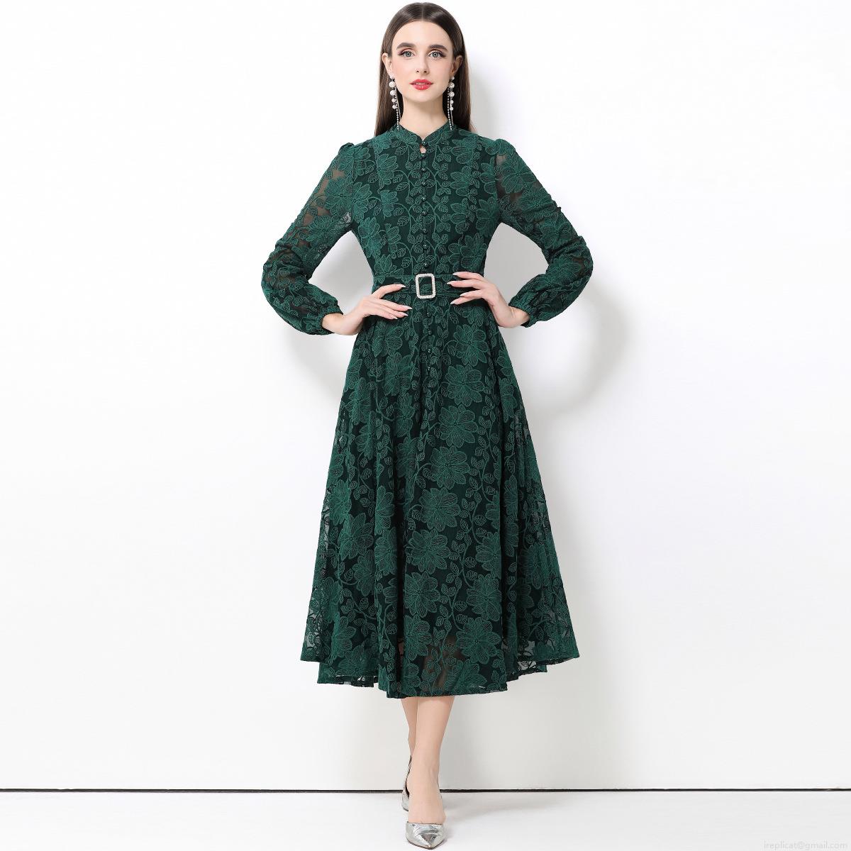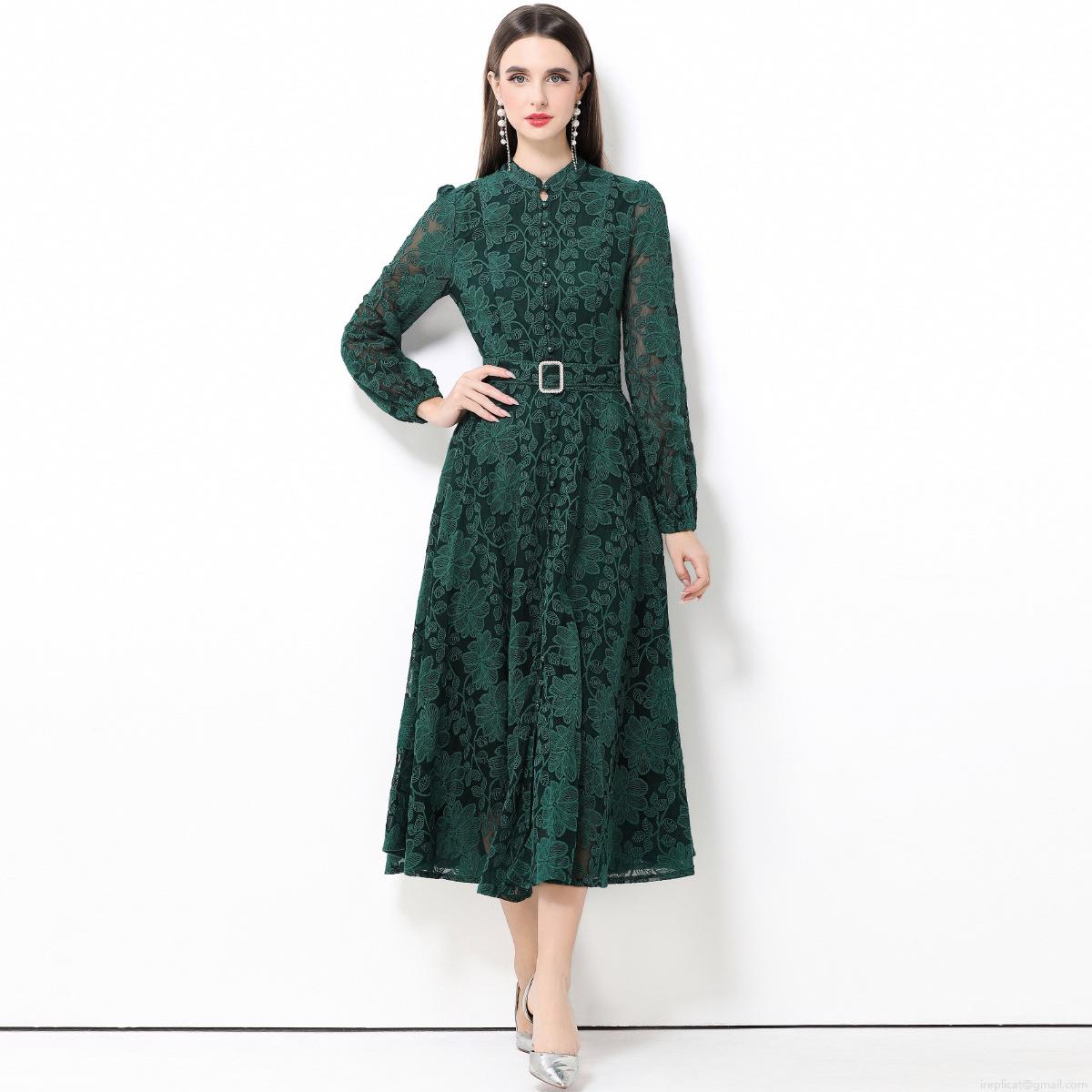 • Elegant French Vintage Lace Embroidery Midi Dress Women Dark Green Lantern Sleeve Stand Collar Button Down Dress With Belt For Party Wedding Office