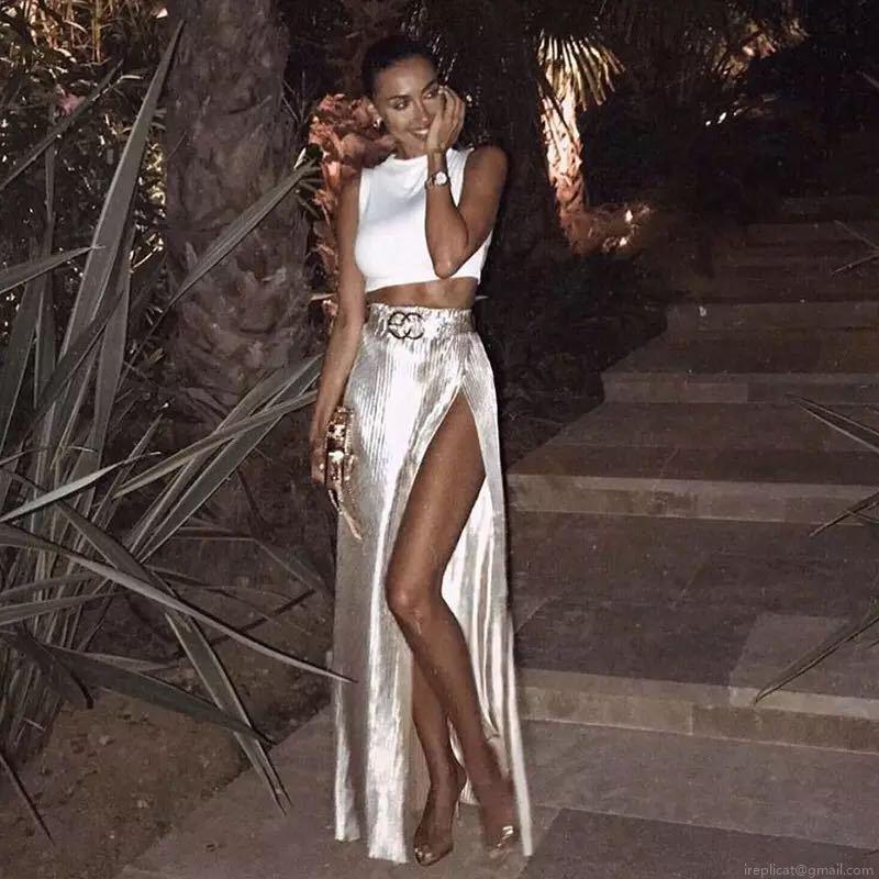 • Elegant High Waist Slit Velvet Maxi Skirt For Women Sexy Accordion Pleat Metallic Gloss Skirts For Party Wedding Banquet Lady Slim Long Skirts