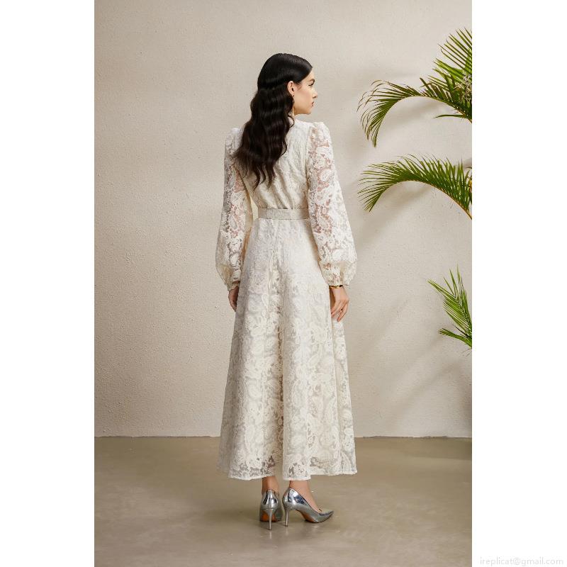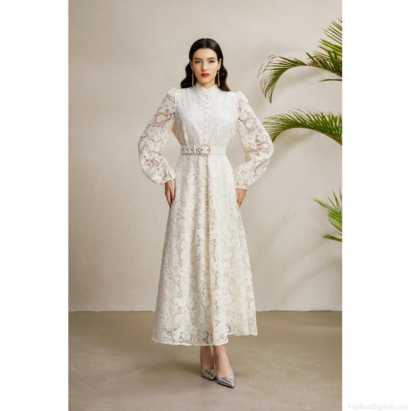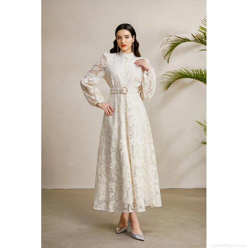 • Elegant Lace Maxi Dress Stand Collar Lantern Sleeve With Belt Vintage Palace Style Floral Long Sleeve A-Line Party Dress For Women Autumn Fashion