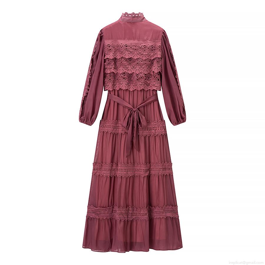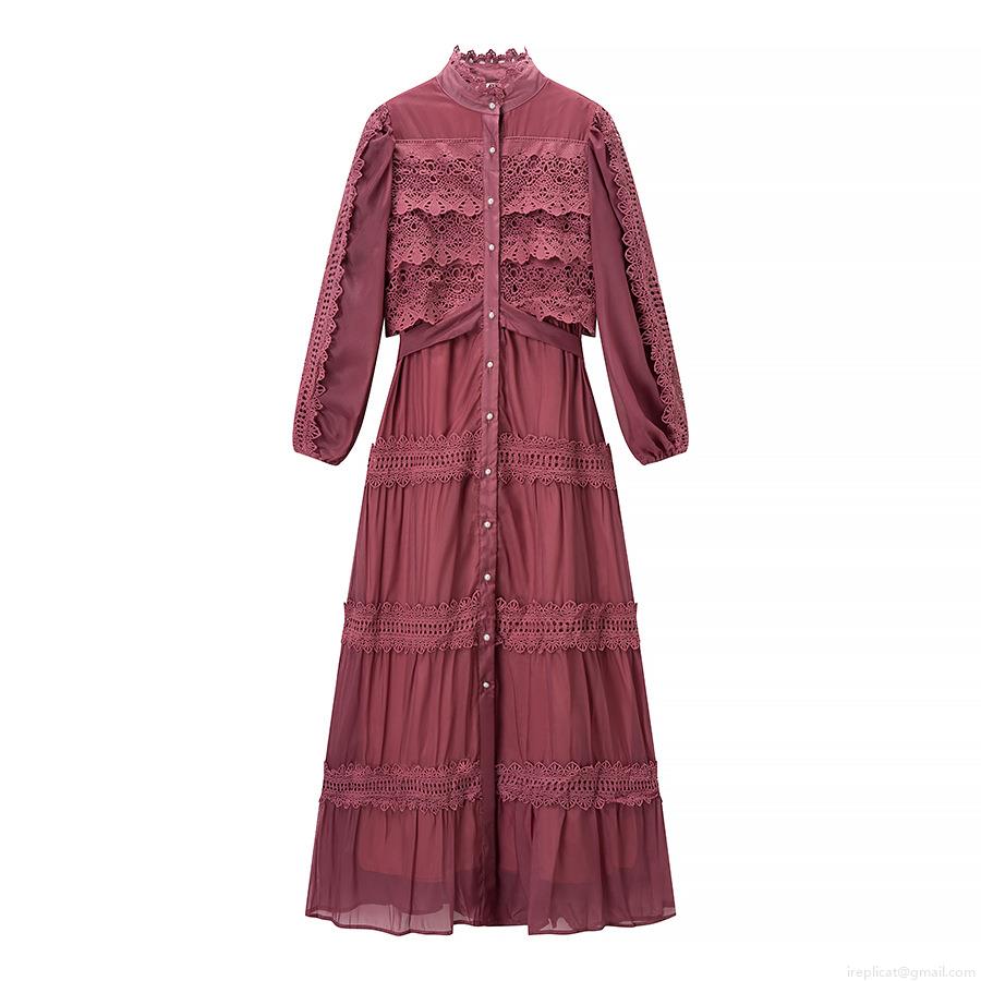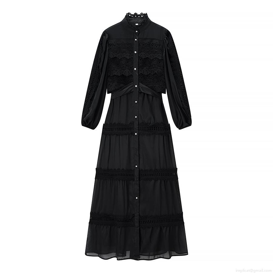 • Elegant Lace Splicing Maxi Dress Women Long Sleeve Hollow Out Mesh Tiered Gown With Stand Collar Pearl Buttons Celebrity Cocktail Party Dress