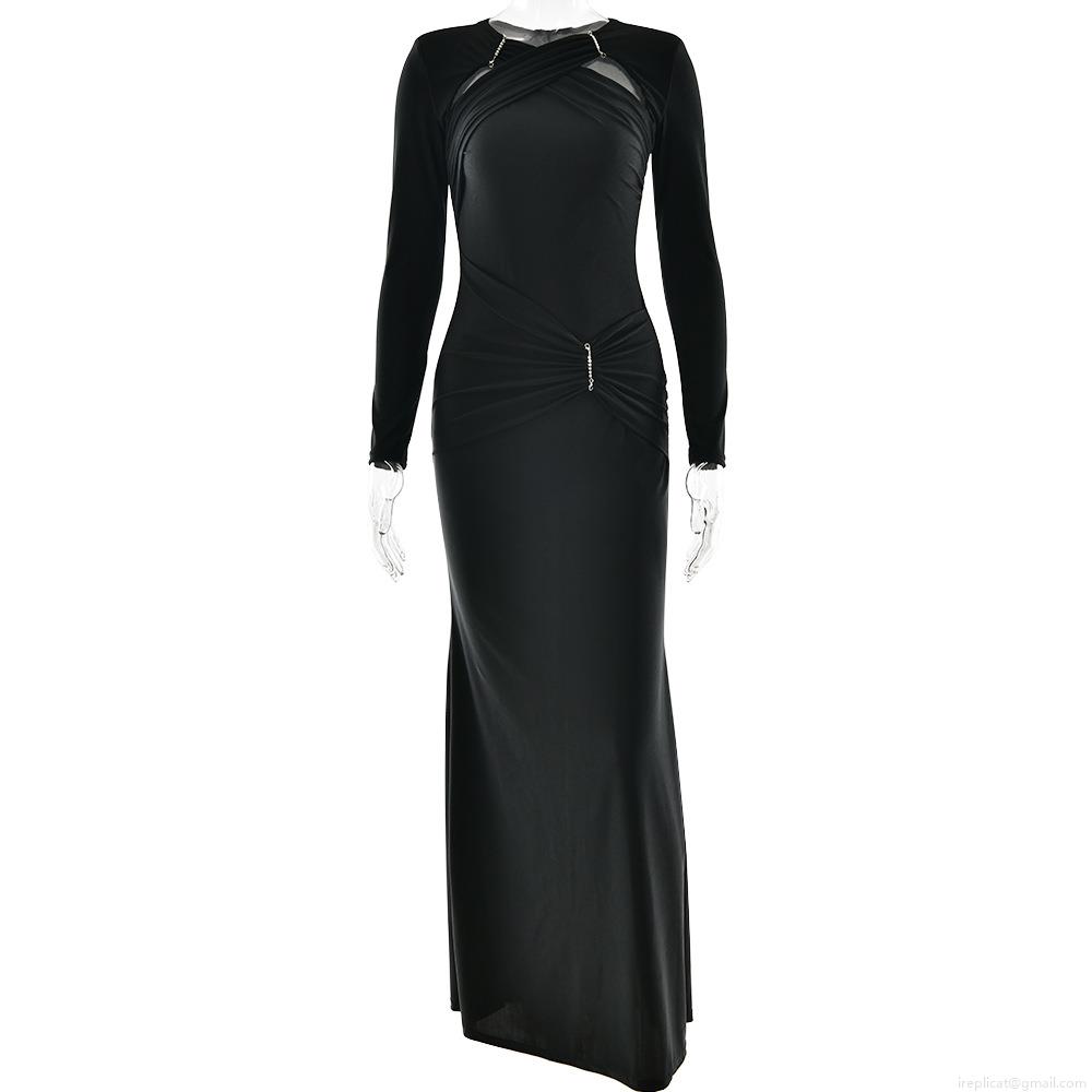 • Elegant Long Sleeve Ruched Evening Dress For Women Sexy Cut Out Satin Maxi Gown With Rhinestone Decor For Party Formal Occasions Fashion Slim Fit Solid Color Long Dresses