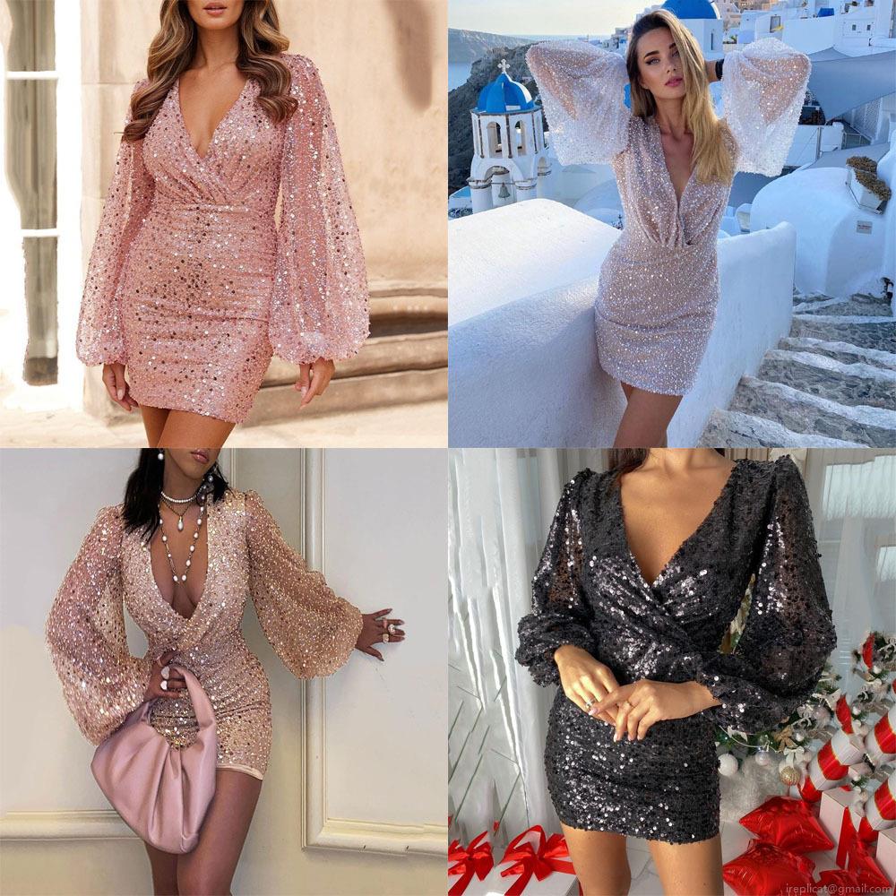 • Elegant V-Neck Sequin Mini Dress With Long Lantern Sleeves Slim Fit Polyester Sequin Cocktail Party Dress For Women Christmas Party Bodycon Dress
