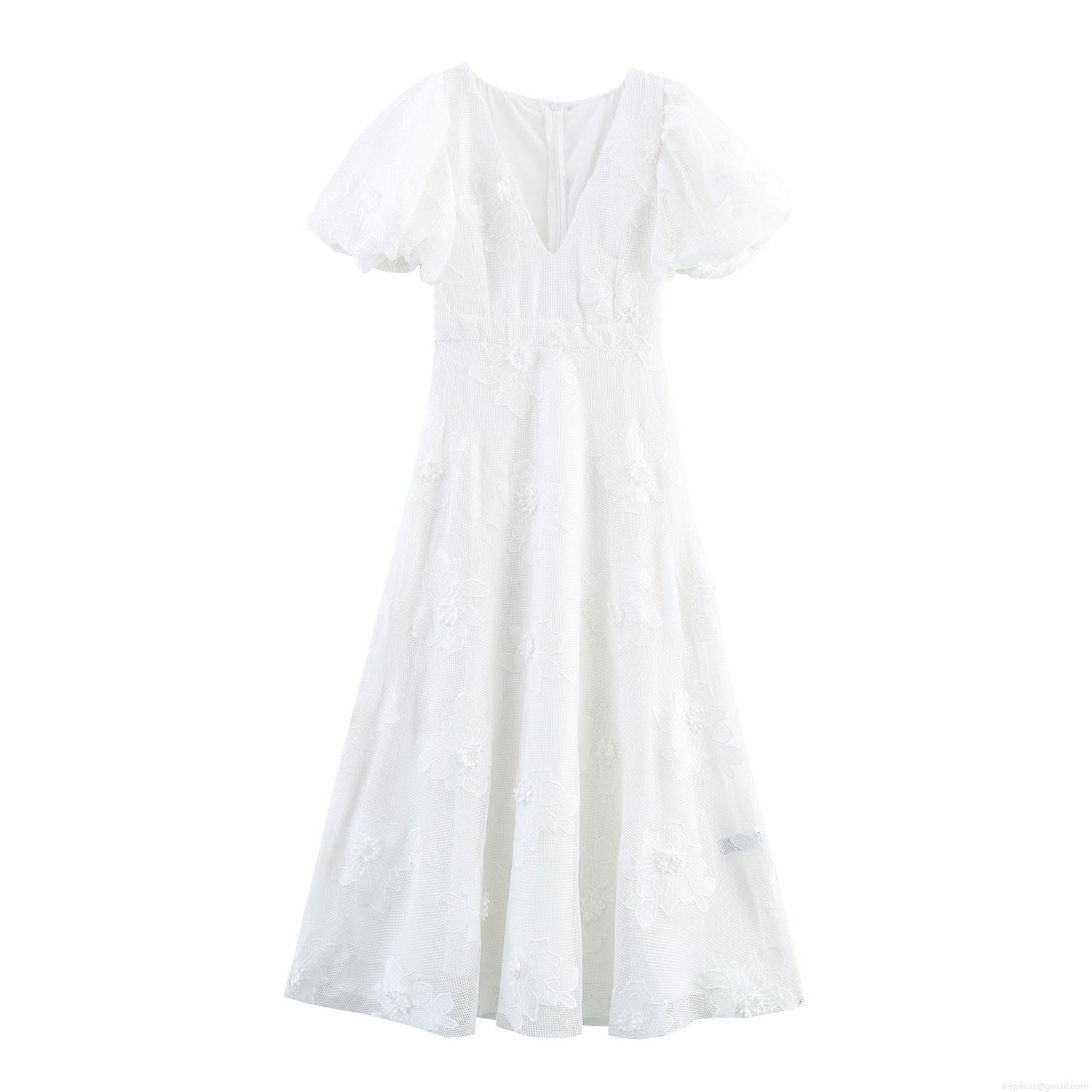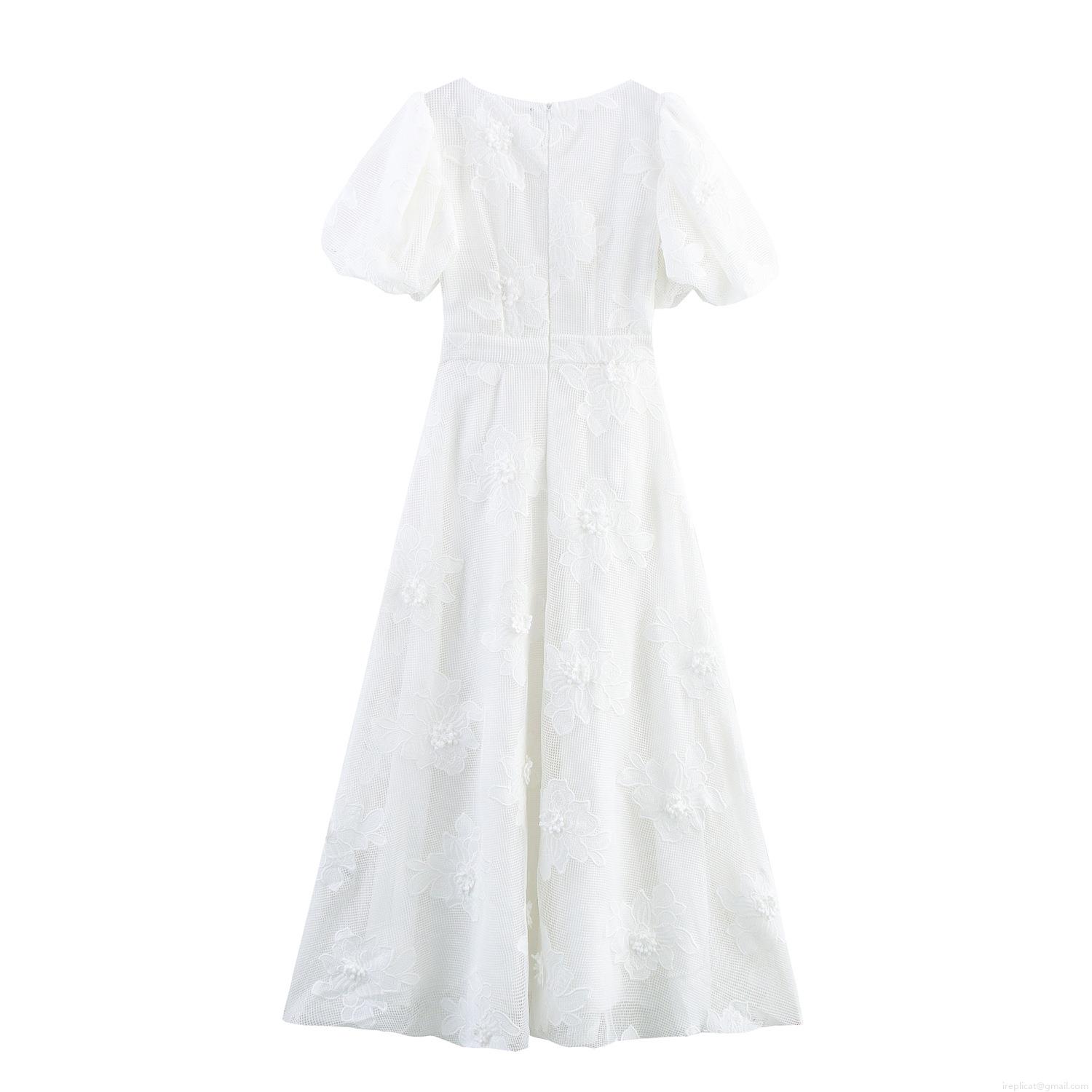 • Elegant White V-Neck Mesh Maxi Dress With 3D Floral Embroidery Puff Sleeve High Waist Lace Long Dress For Women Wedding Party Banquet Vacation