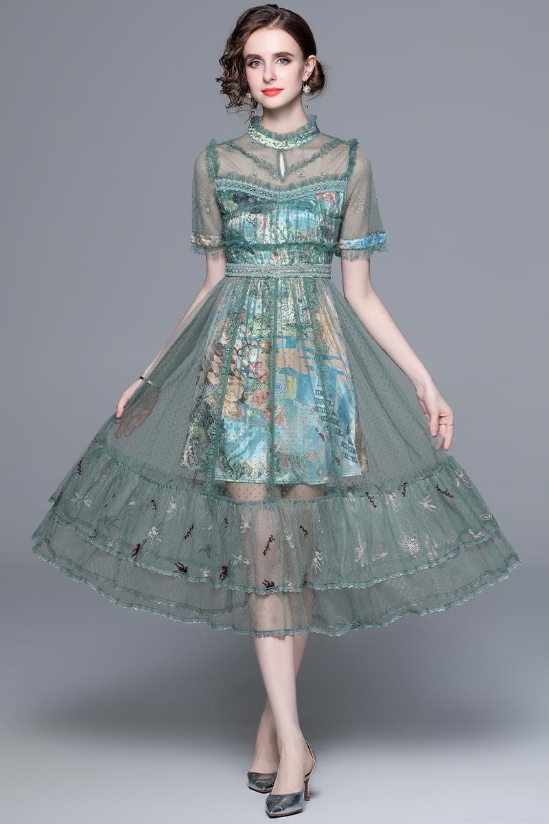 Waist-cinching Design, Retro Embroidery, Layers Of Mesh, Sheer Cuffs