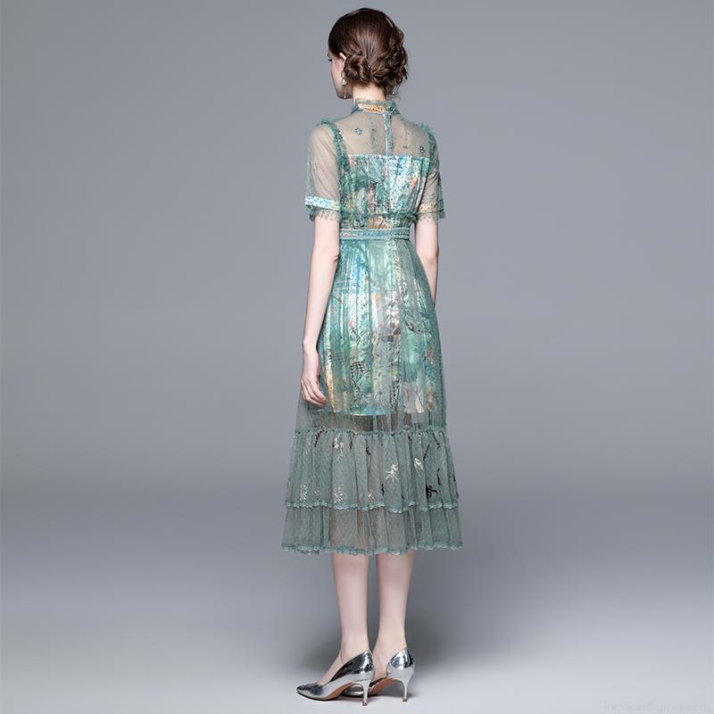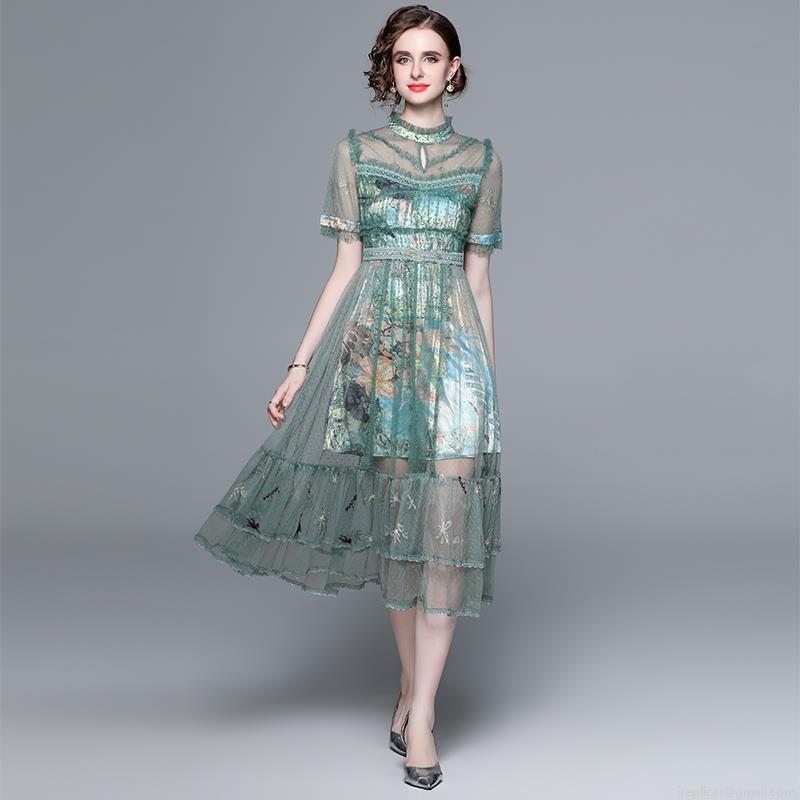 Elegant Women Mesh Embroidery Floral Midi Dress Short Sleeve Ruffle Summer Party Dress Vintage High Waist A-Line Evening Gown
