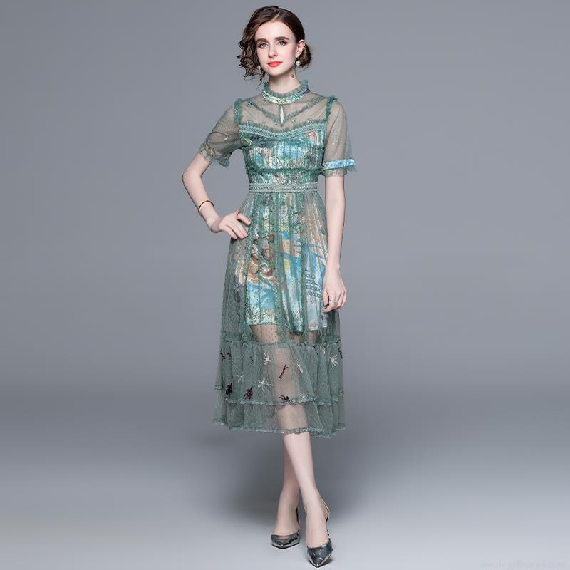 • Elegant Women Mesh Embroidery Floral Midi Dress Short Sleeve Ruffle Summer Party Dress Vintage High Waist A-Line Evening Gown