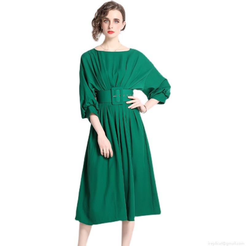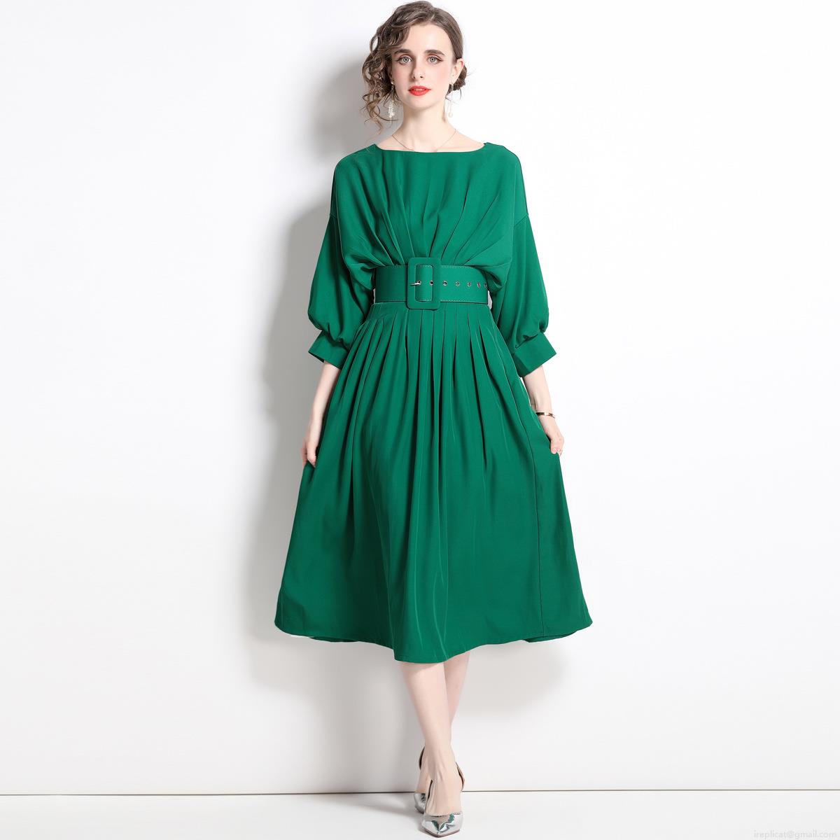Elegant Women Pleated Midi Dress With Belt 100% Polyester Round Neck Batwing Sleeve A-Line Party Dress Vintage High Waist Solid Color Dress For Ladies