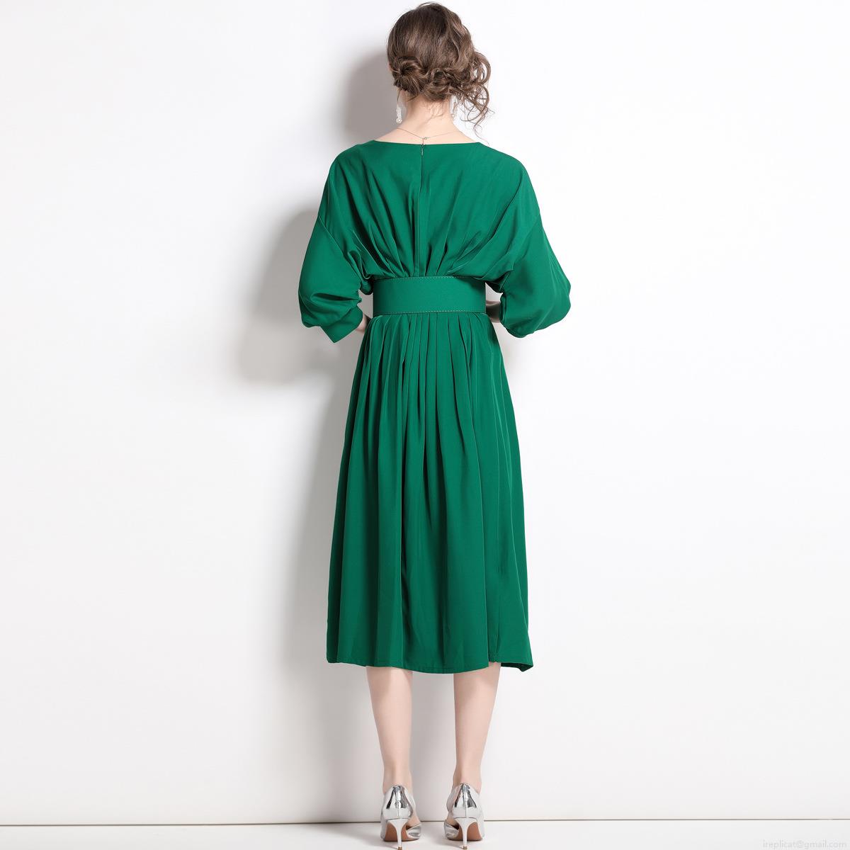 • Elegant Women Pleated Midi Dress With Belt 100% Polyester Round Neck Batwing Sleeve A-Line Party Dress Vintage High Waist Solid Color Dress For Ladies