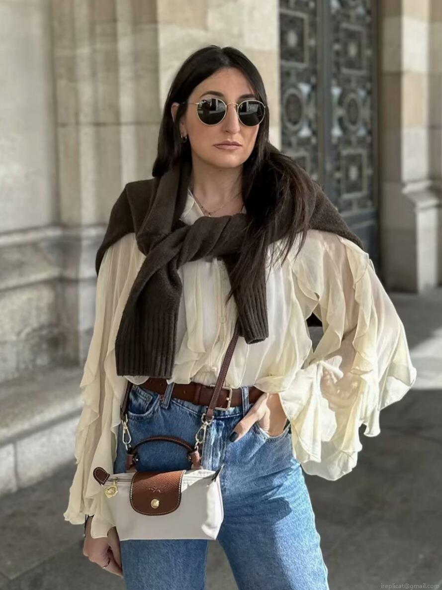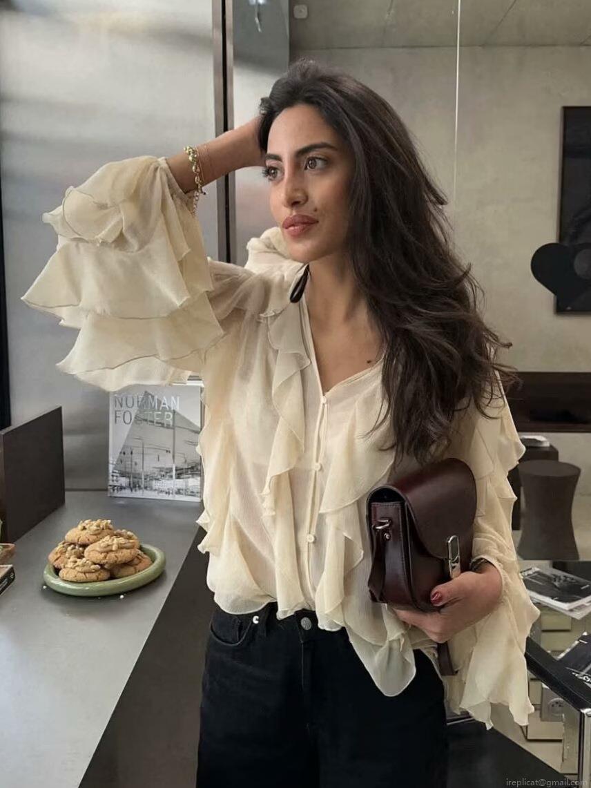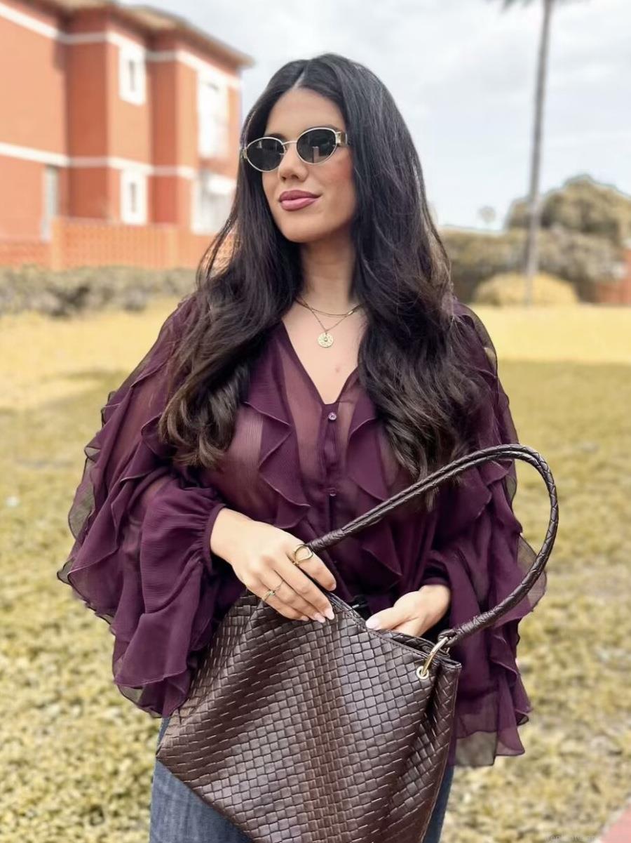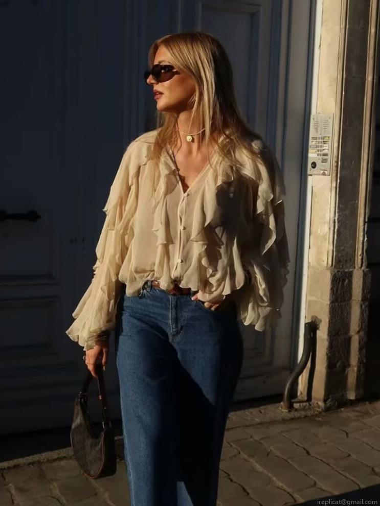 • Elegant Women's Ruffle Layered Chiffon Blouse V-Neck Long Sleeve Button Down Shirt Solid Color French Vintage Style Tops for Daily Office Dating Party