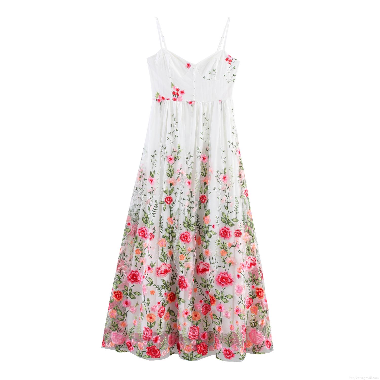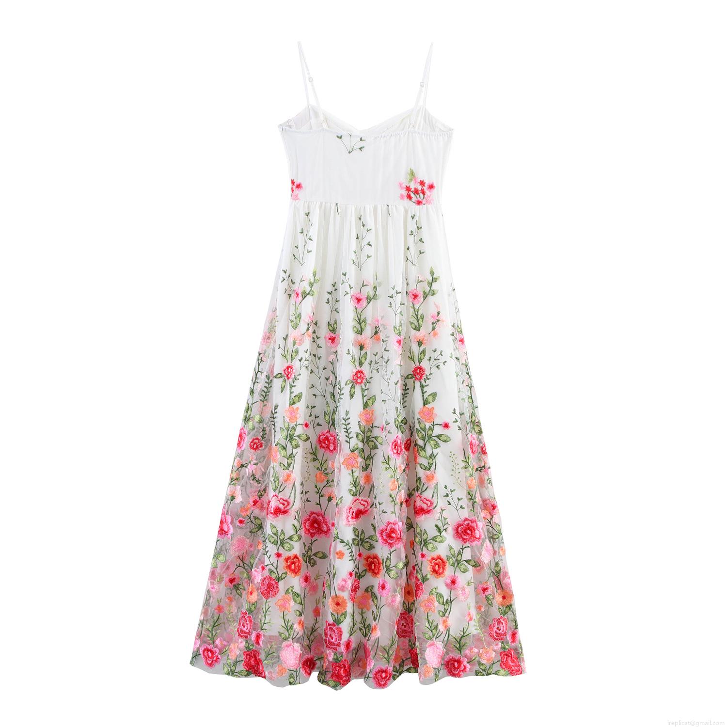 • Elegant Women's White Mesh Floral Embroidery Maxi Dress With Pearl Buttons Sweet Sleeveless Slip Long Dress For Wedding Party Summer Vacation