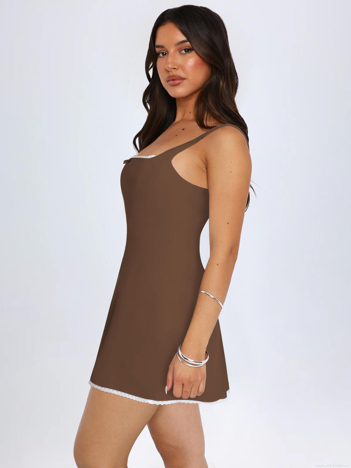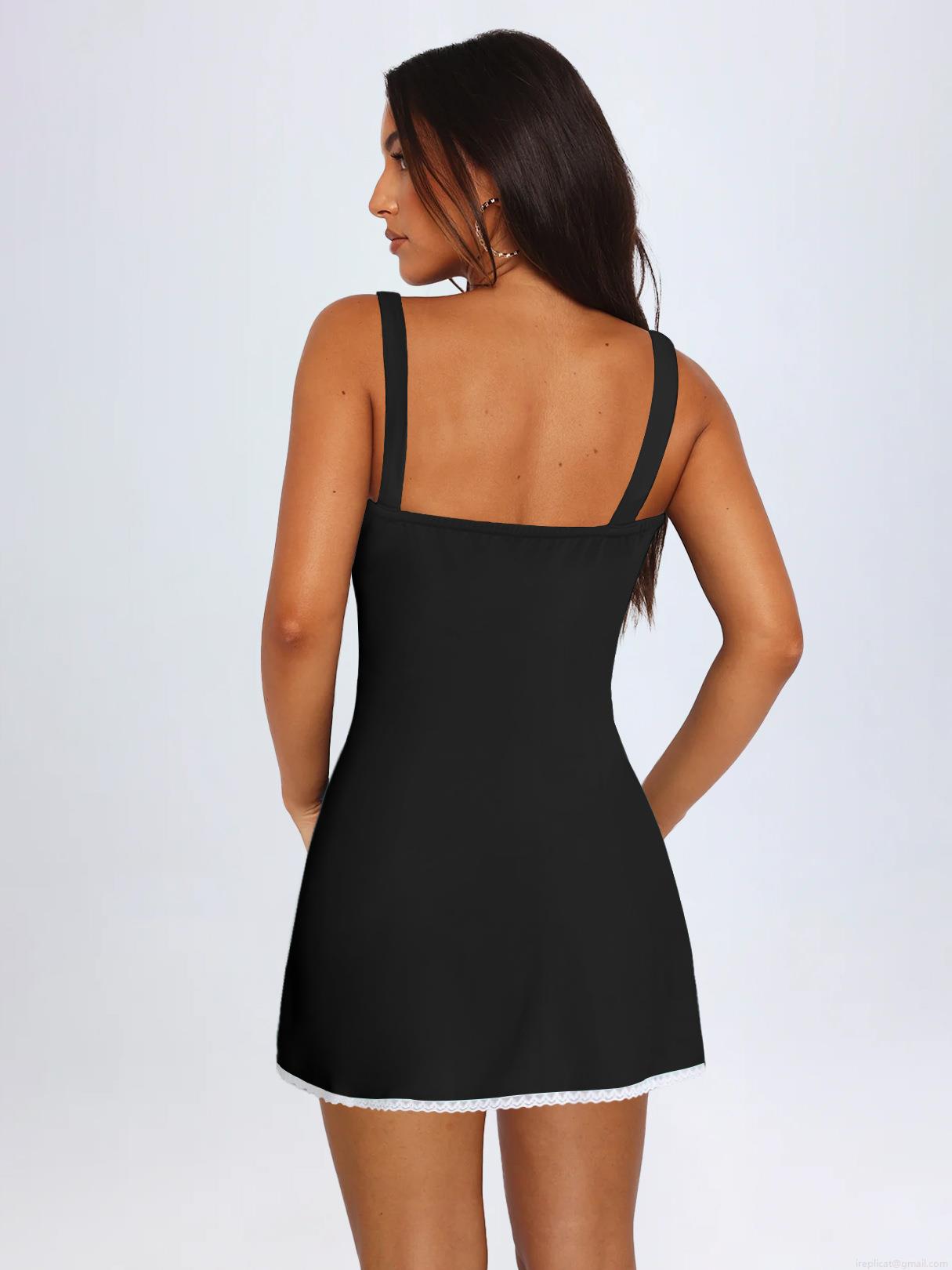 French Audrey Hepburn Style Contrast Lace Trim Mini Dress Women Sexy Slim Fit Square Neck Spaghetti Strap Bodycon Party Clubwear Dress With Bow