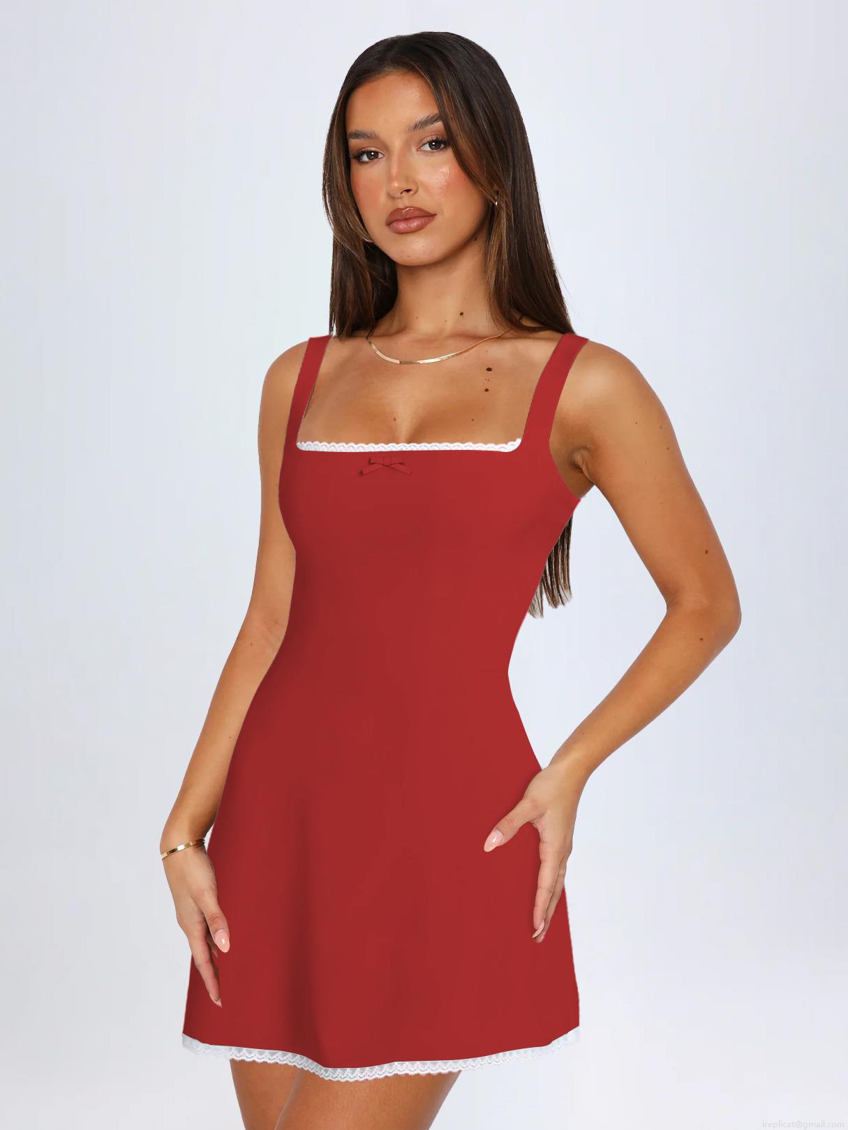 • French Audrey Hepburn Style Contrast Lace Trim Mini Dress Women Sexy Slim Fit Square Neck Spaghetti Strap Bodycon Party Clubwear Dress With Bow