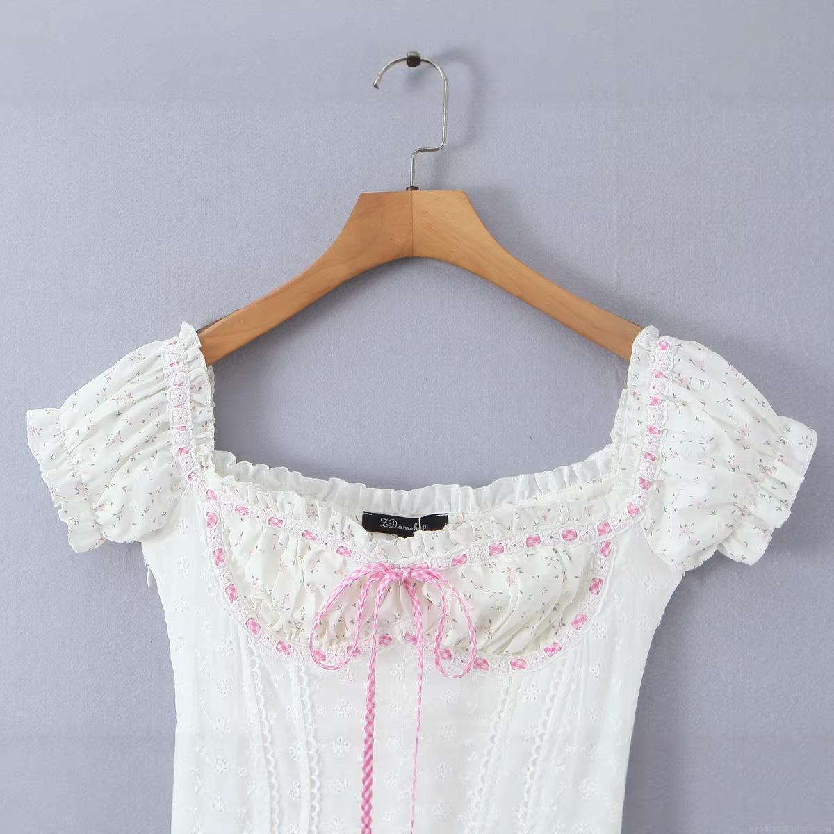 Bow, Floral Pattern, Printing, Lace Trim, Puff Sleeves, Off-shoulder, Herringbone Waist Trainer