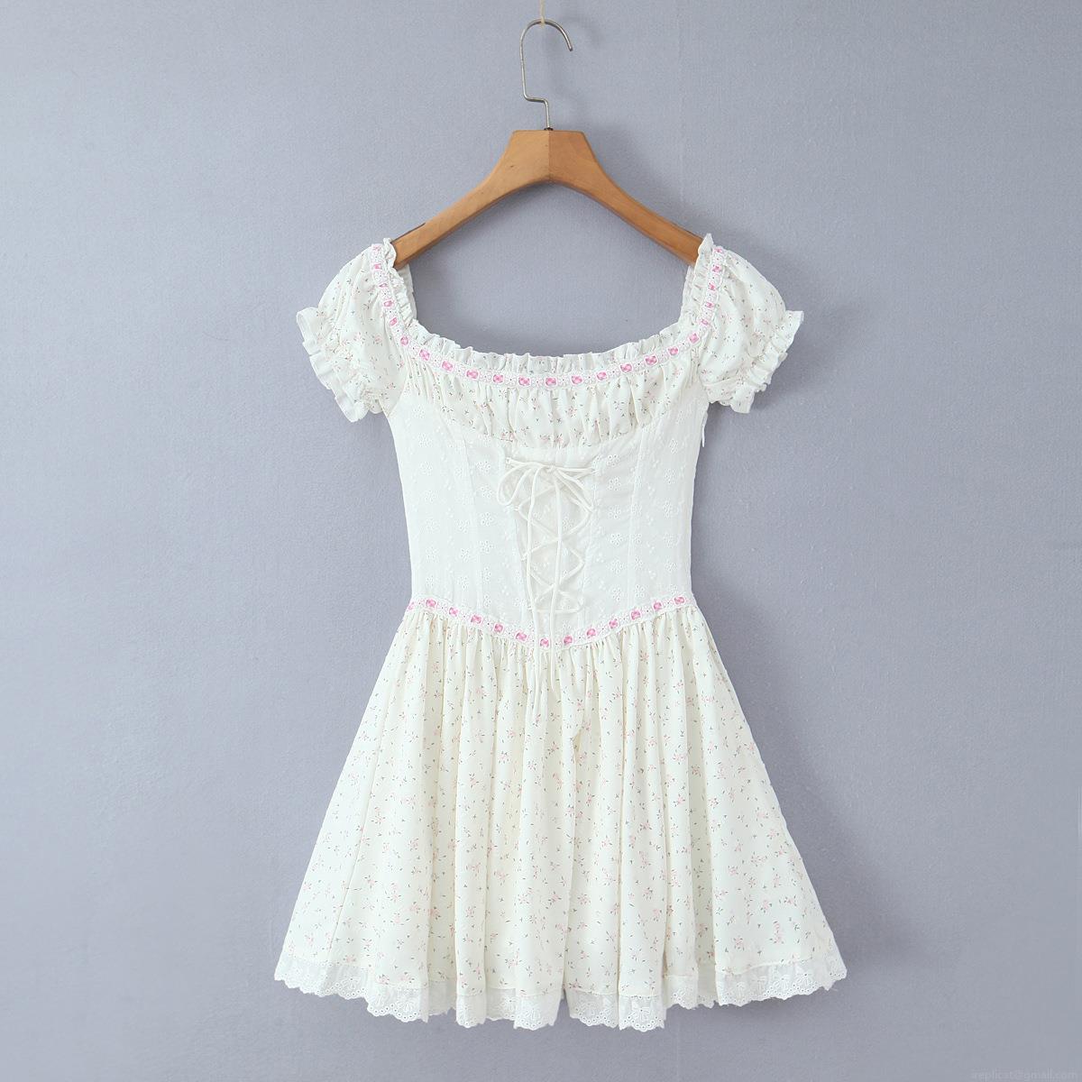 French Retro Off Shoulder Floral Mini Dress With Fishbone Corset Lace Trim Puff Sleeve Cotton Blend For Women Summer Vacation Cottagecore Style Sweet A-line Pullover Short Sleeve Dress