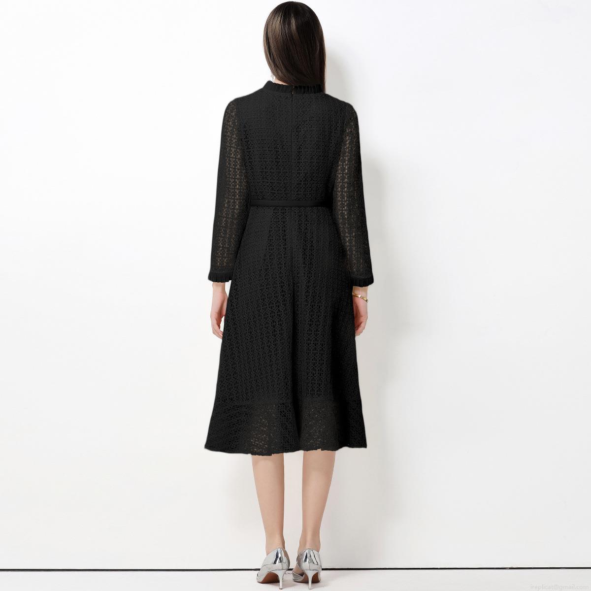 French Style Elegant Lace Slim Waist Midi Dress With Belt Stand Collar Long Sleeve Celebrity Temperament Autumn Retro Long Skirt For Women