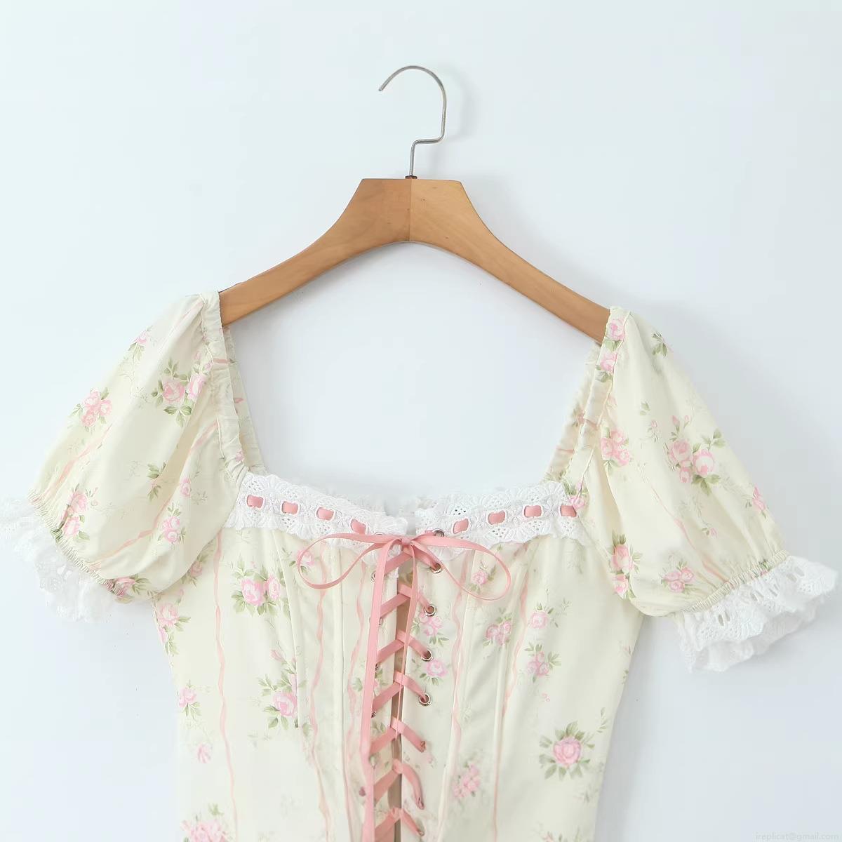 French Vintage Floral Midi Dress For Women Summer Square Neck Puff Sleeve Lace Trim Corset Style Lace Up Waist Rose Print Sweet Cottagecore Vacation Party Slim Fit Dress