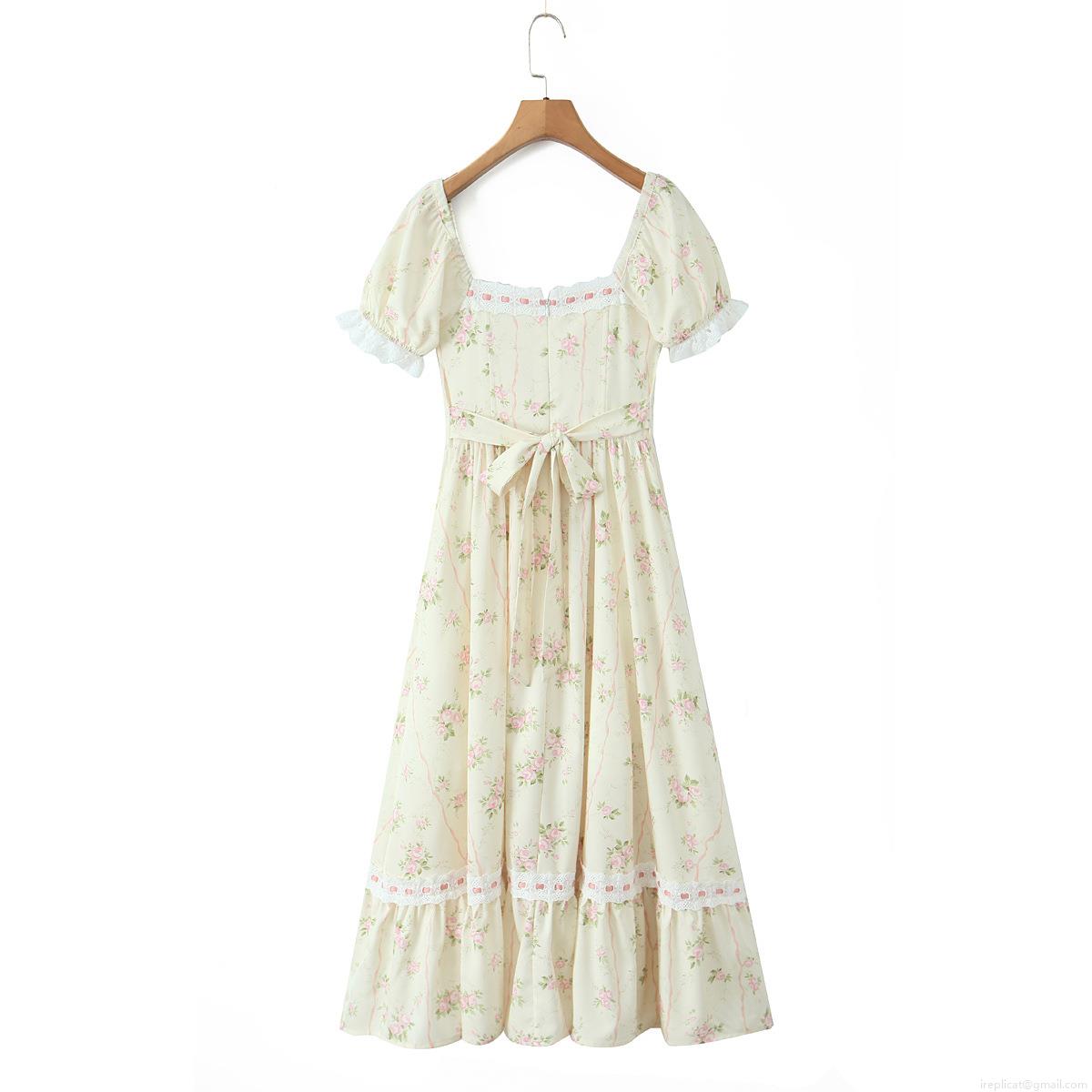 • French Vintage Floral Midi Dress For Women Summer Square Neck Puff Sleeve Lace Trim Corset Style Lace Up Waist Rose Print Sweet Cottagecore Vacation Party Slim Fit Dress