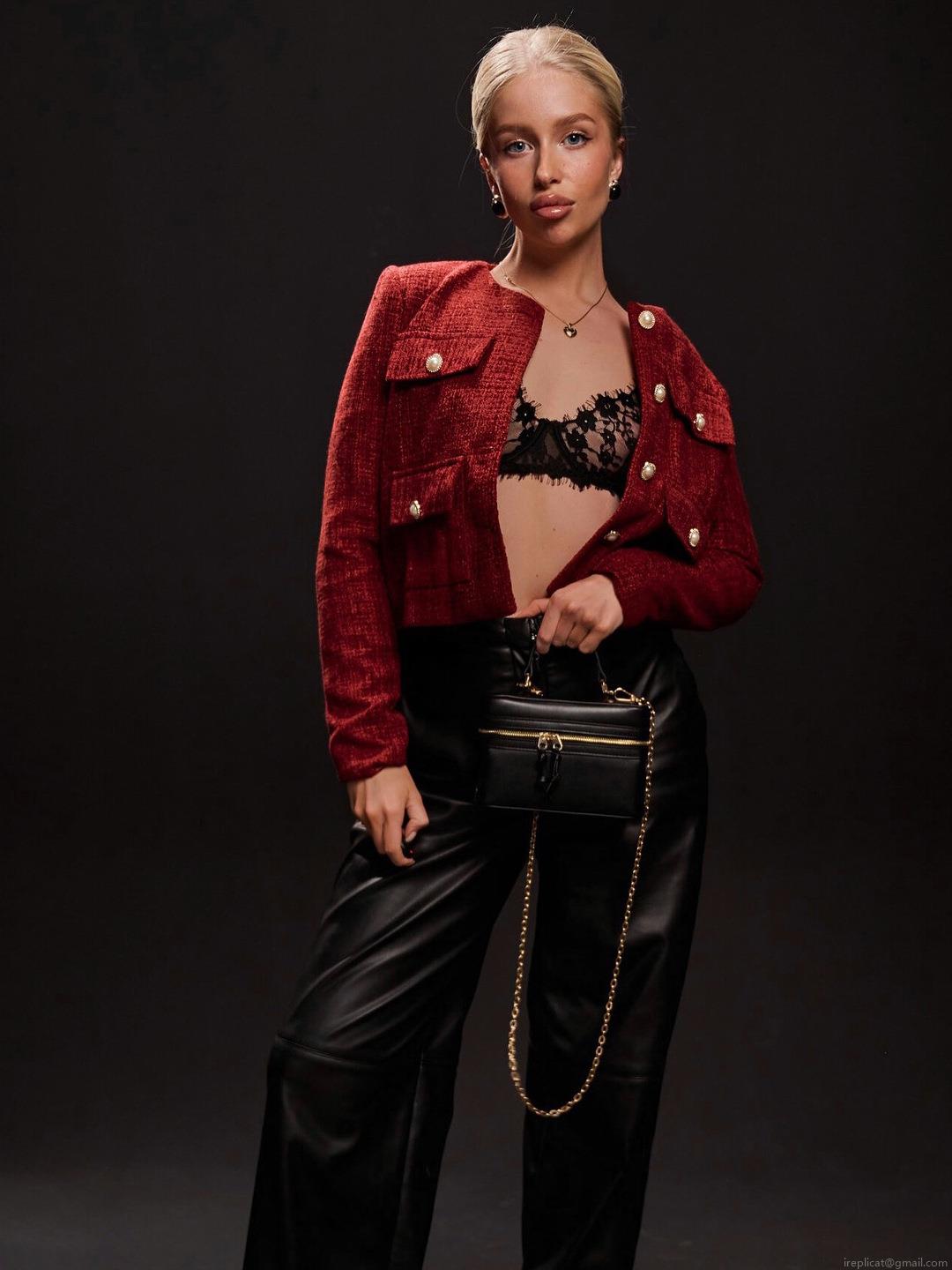 Solid Color, Pearl Button, Tweed, Woven Texture, Metal Round Buckle, Multi-pocket Design