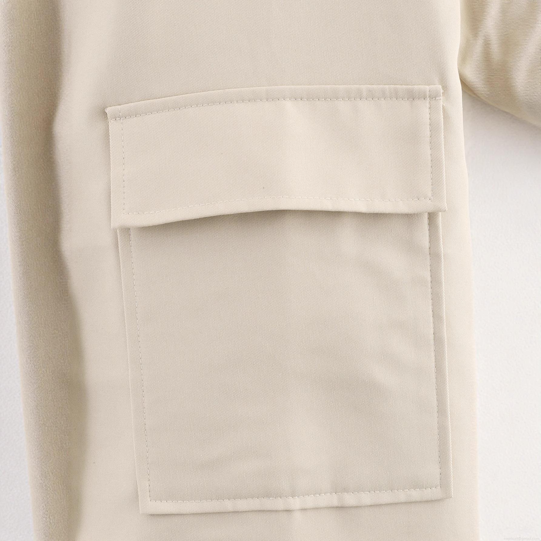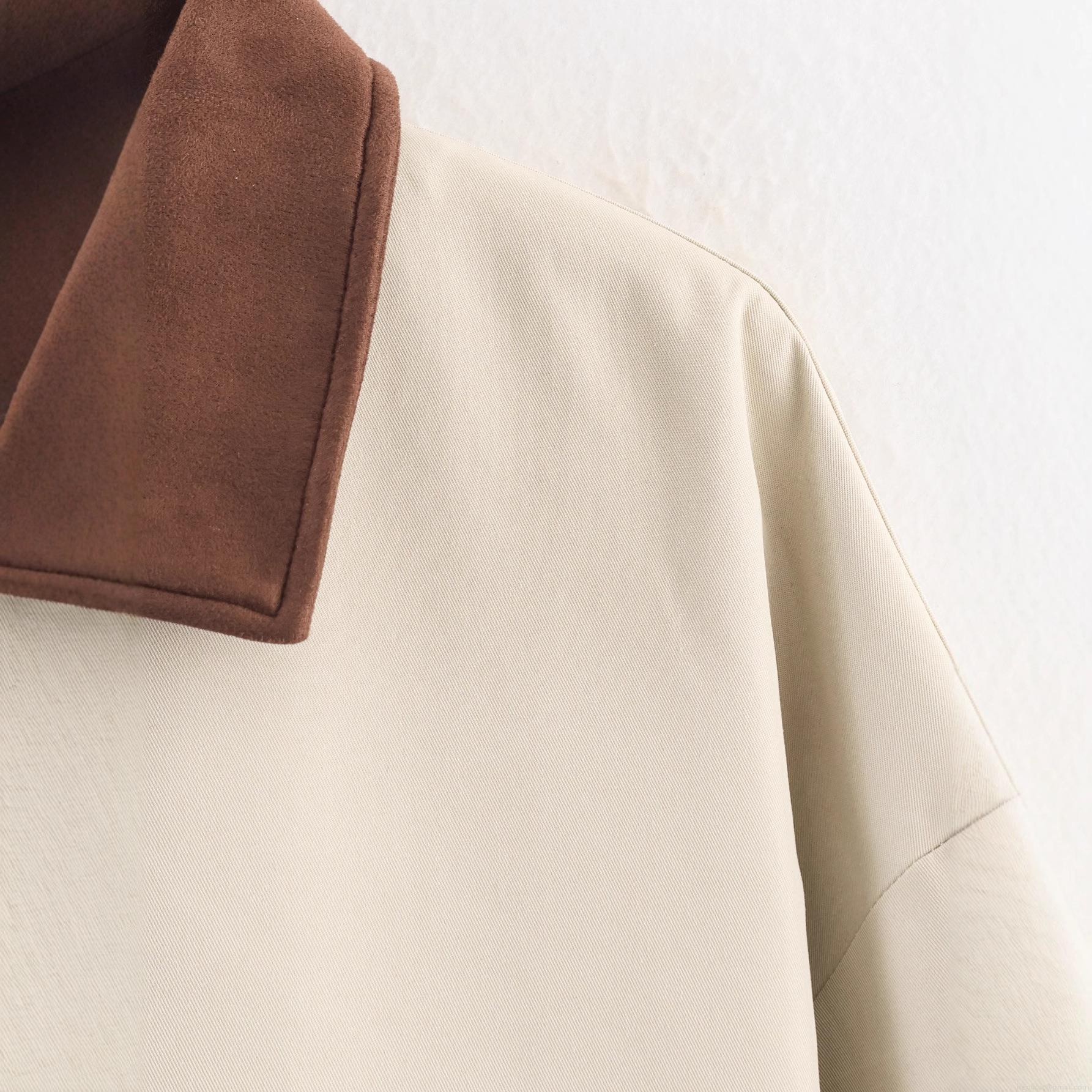 • French Vintage Women Fashion Khaki Color Block Jacket Windbreaker Polyester Suede Trim Turn-down Collar Patch Pockets Single Breasted Casual Outerwear