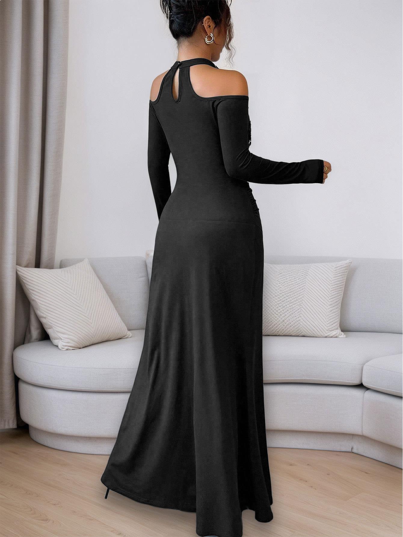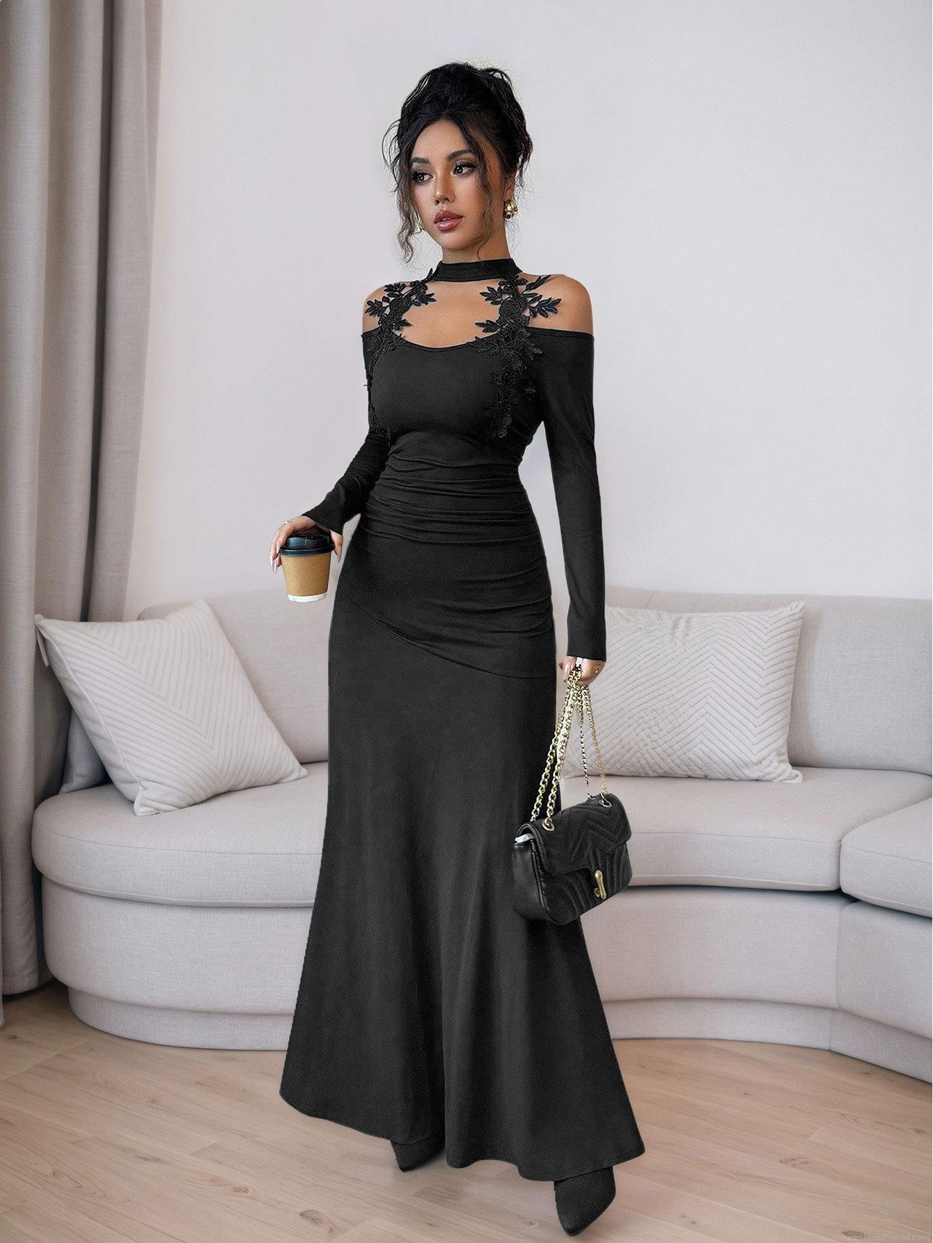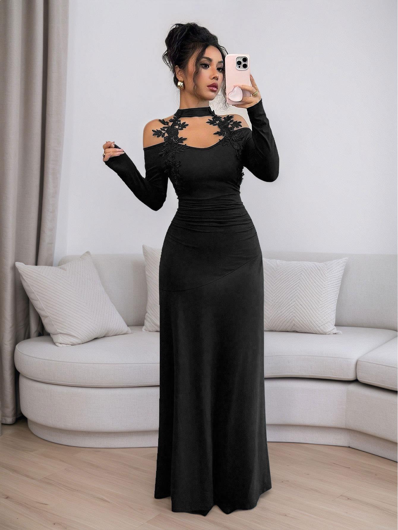 • Black Bodycon Maxi Dress For Women Elegant Long Sleeve Halter Hollow Lace Flower Applique Slim Fit Party Evening Gown
