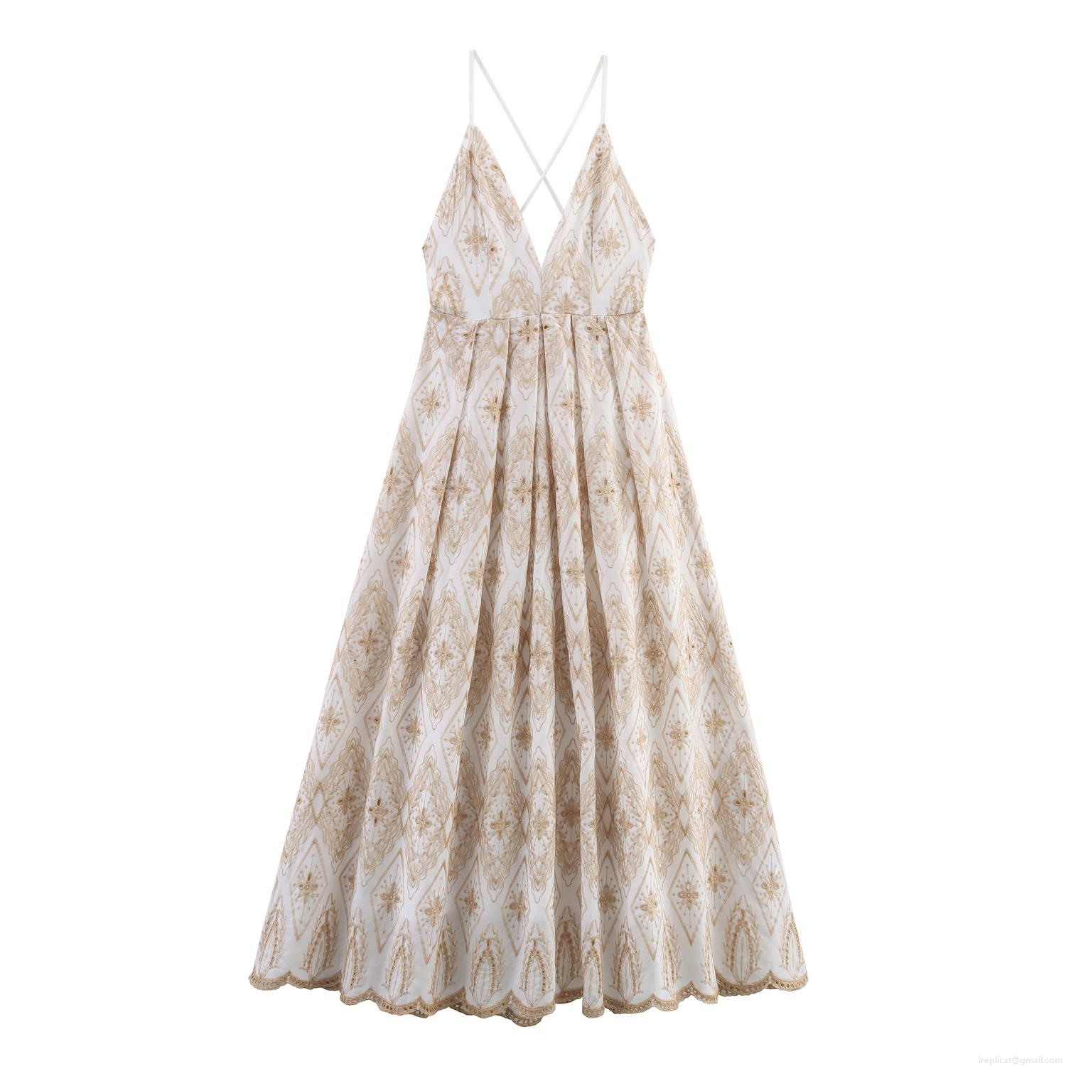 • Bohemian Embroidered Maxi Dress Backless V-Neck Camisole Resort Style White Polyester Cotton Blend Long Dress for Women Summer Vacation Party