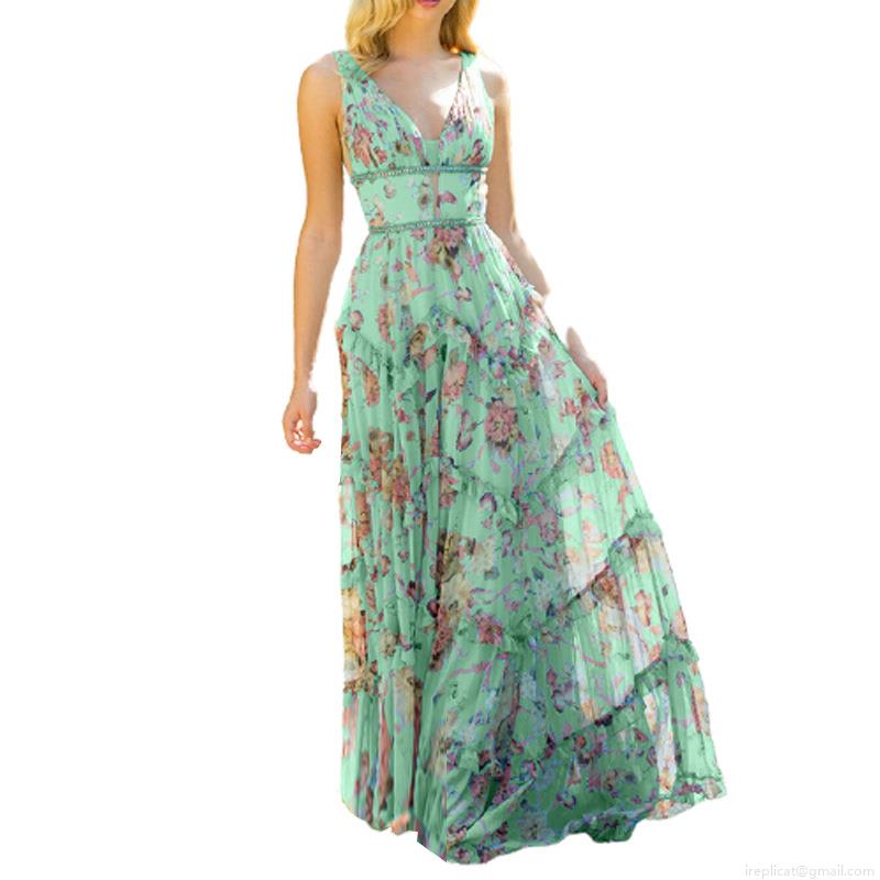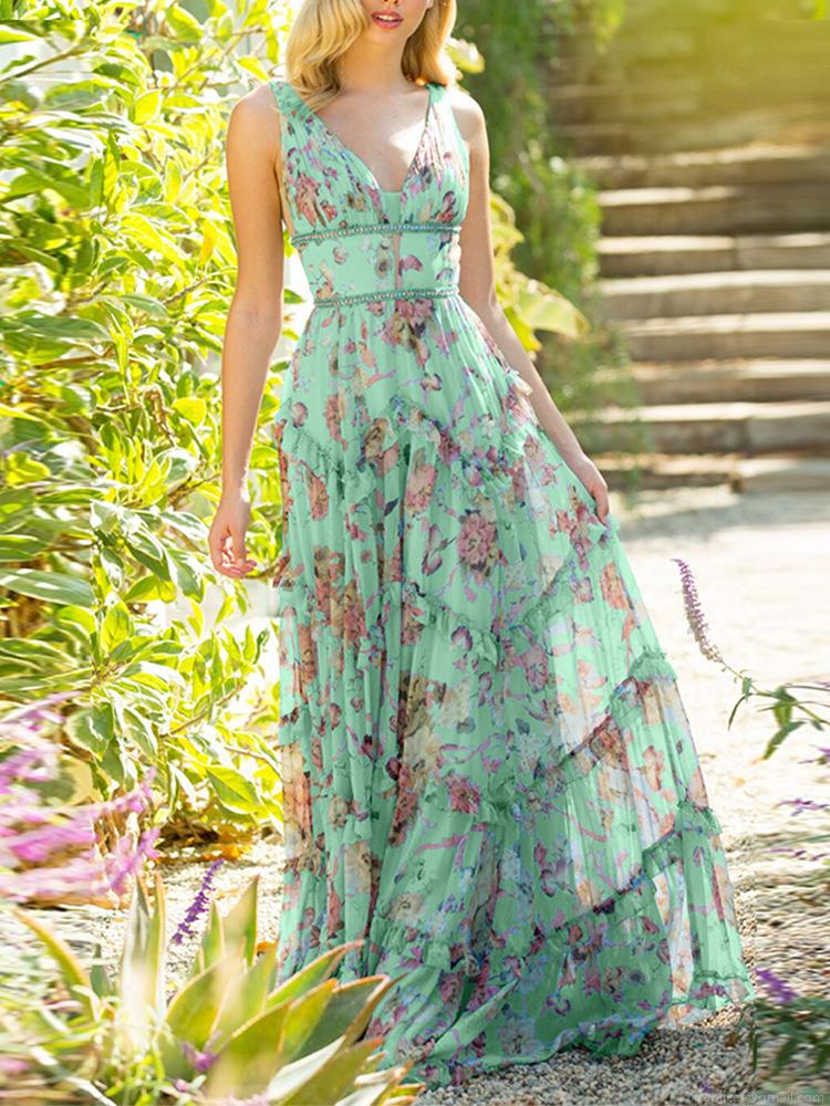 • Bohemian Floral Print Maxi Dress For Women Deep V Neck Sleeveless High Waist Tiered Ruffle Layered Chiffon Long Sundress Summer Beach Vacation Party