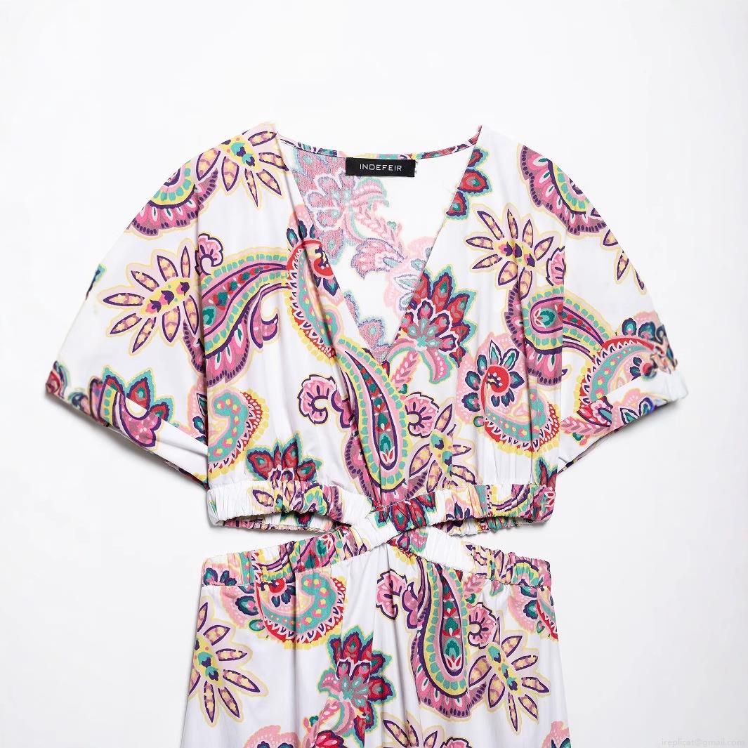 • Bohemian Paisley Print V Neck Hollow Out Tiered Maxi Dress Women Short Sleeve Elegant Blended Polyester Beach Vacation Party Dress