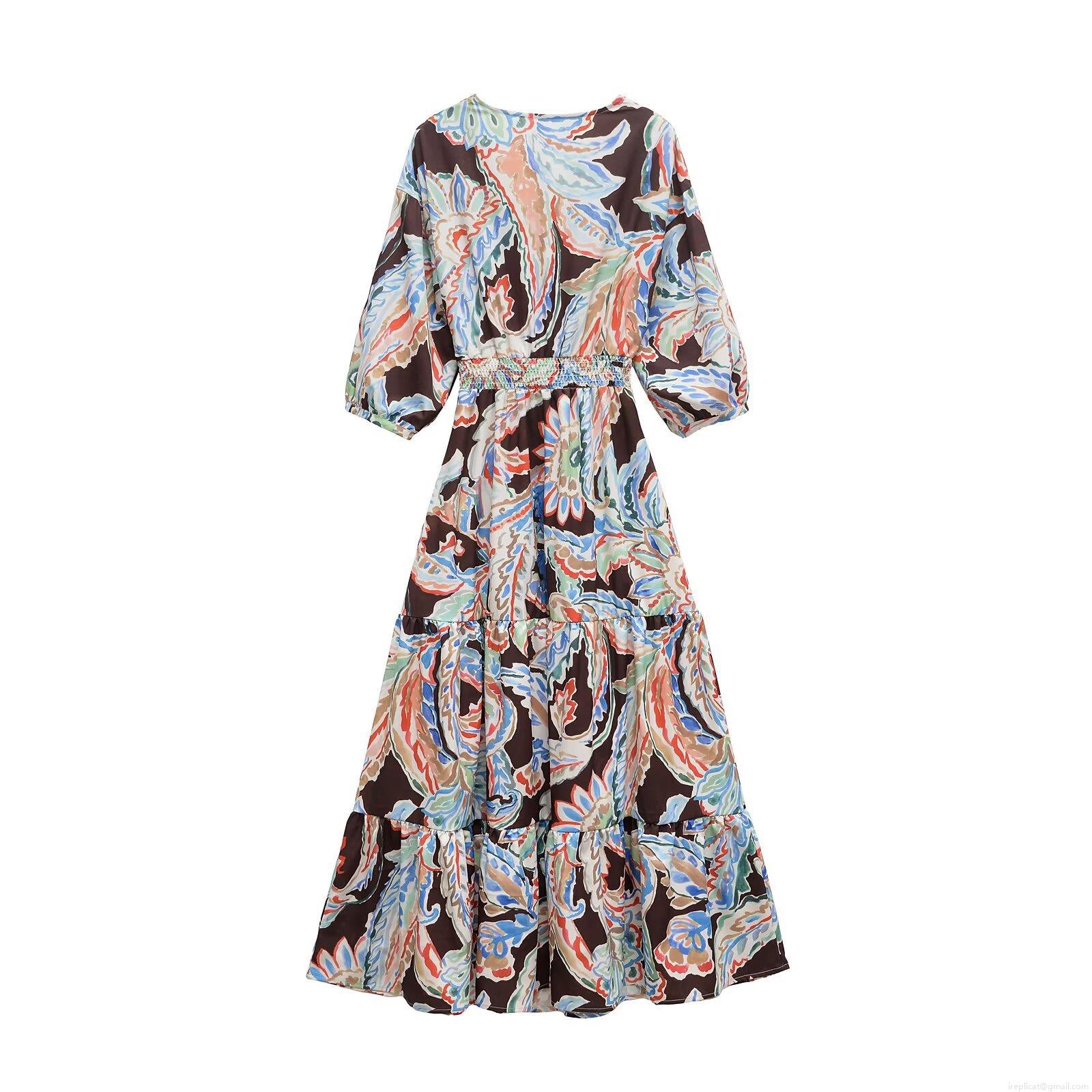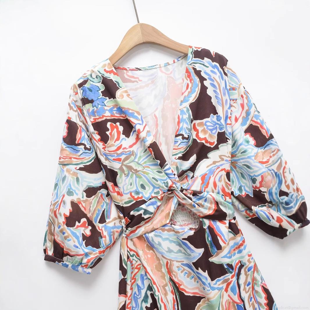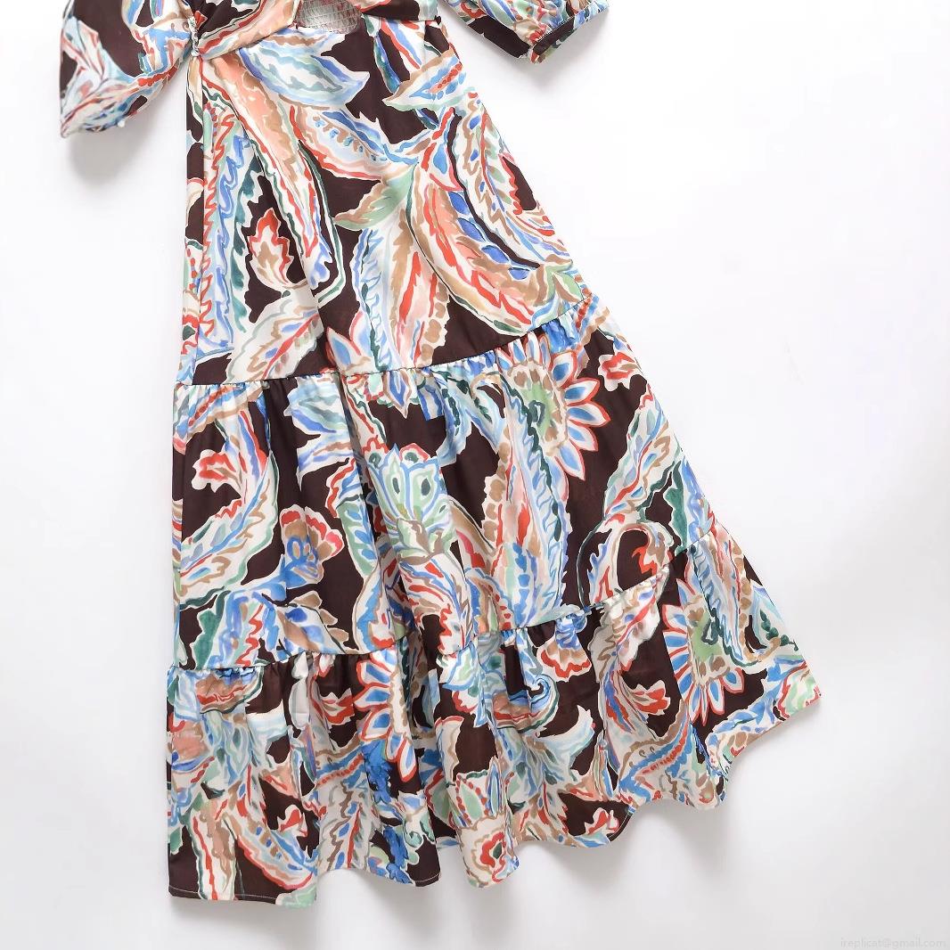 Puff Sleeves, Abstract Flowers, Paisley Print, Waist Cutout, Multi-tiered Cake Skirt, V-neck Knot