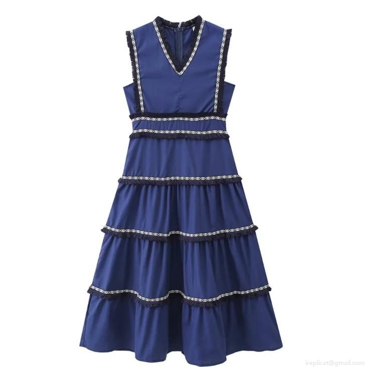 • Bohemian Sleeveless V Neck Tiered Maxi Dress With White Embroidery And Tassel Trim Vintage Dark Blue Polyester Long Dress For Women Summer Vacation Party