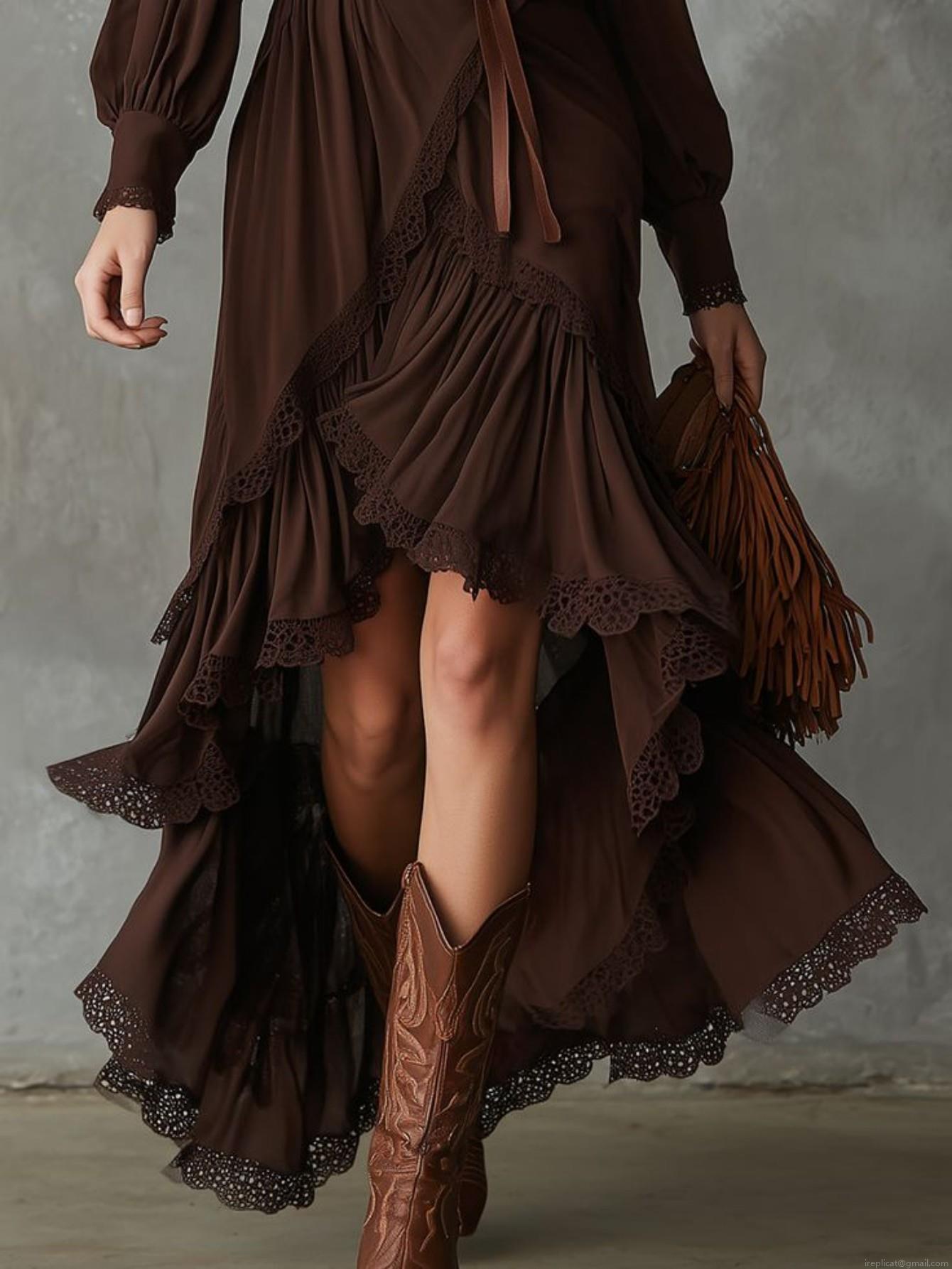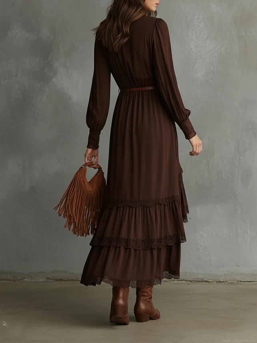 • Bohemian V-Neck Lace Ruffle Asymmetric Hem Long Sleeve Maxi Dress For Women Dark Brown Elegant Vacation Streetwear Long Dress