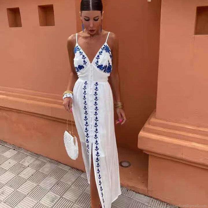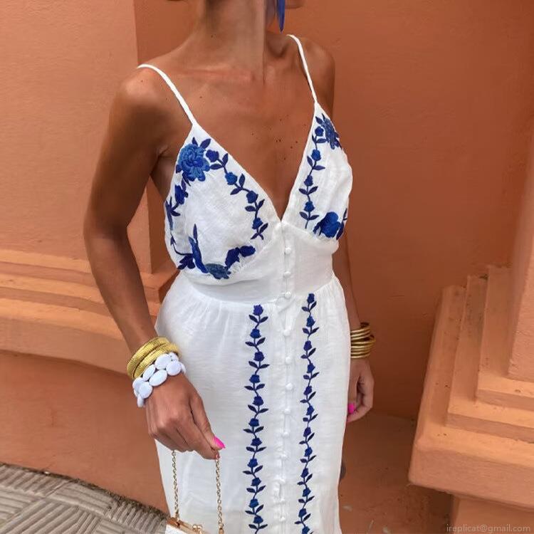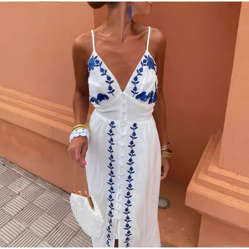 • Bohemian Women White Slip Maxi Dress With Blue Floral Embroidery V-Neck Button Front Open Back High Waist Split Summer Beach Vacation Long Dress