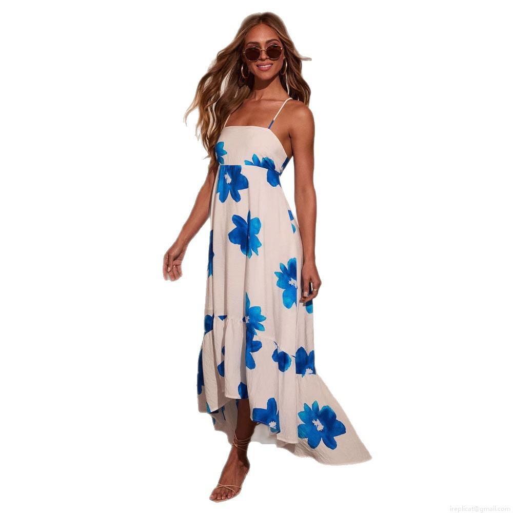 Floral Pattern, Ruffles, Printing, Backless, Large Flower, Cross Straps, Irregular Hem