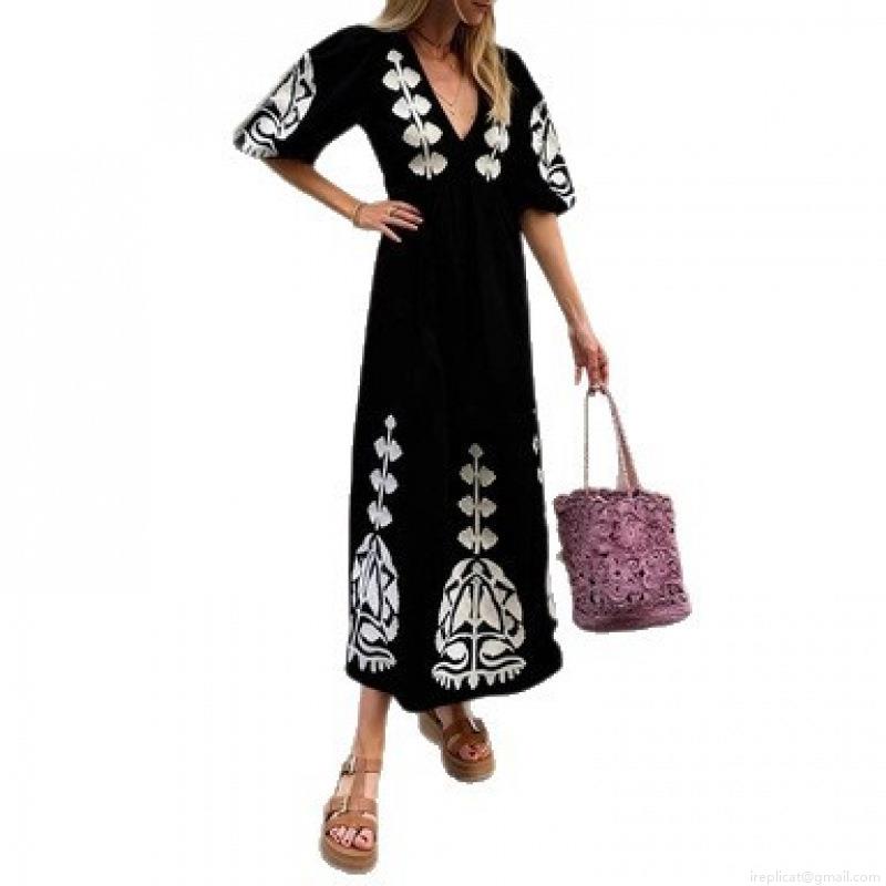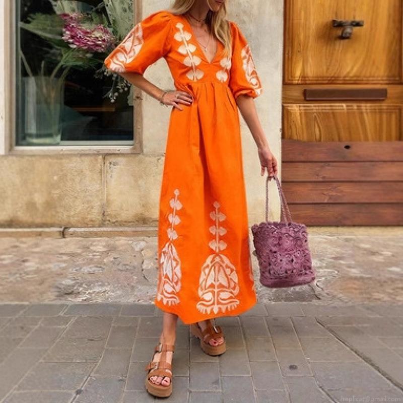 • Boho Women V-Neck Maxi Dress Puff Sleeve Embroidered Print Loose Casual Vacation Ethnic Long Dress For Women Summer Beachwear