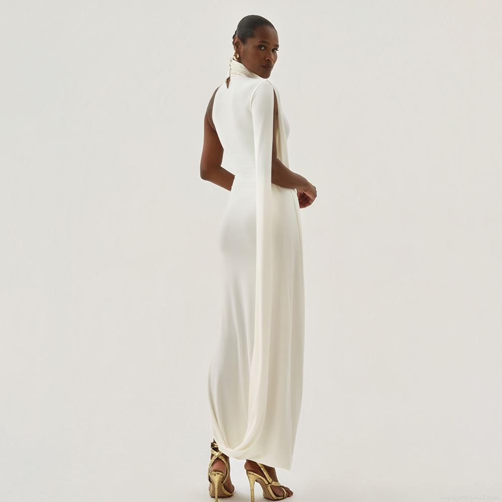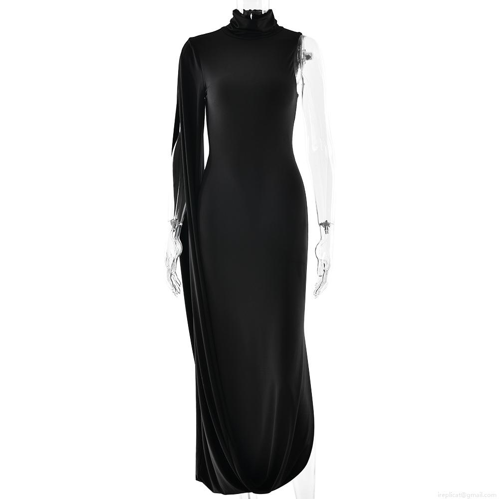 Elegant Asymmetric One Shoulder Cape Sleeve Maxi Dress Sexy High Neck Side Split Slim Fit Evening Party Banquet Long Dress For Women
