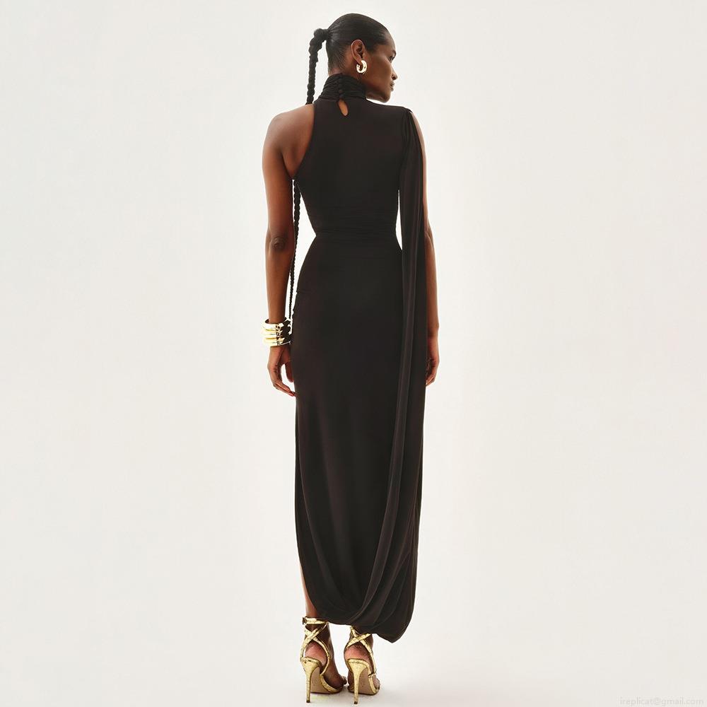 • Elegant Asymmetric One Shoulder Cape Sleeve Maxi Dress Sexy High Neck Side Split Slim Fit Evening Party Banquet Long Dress For Women