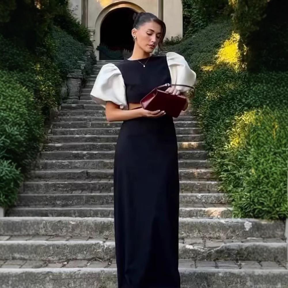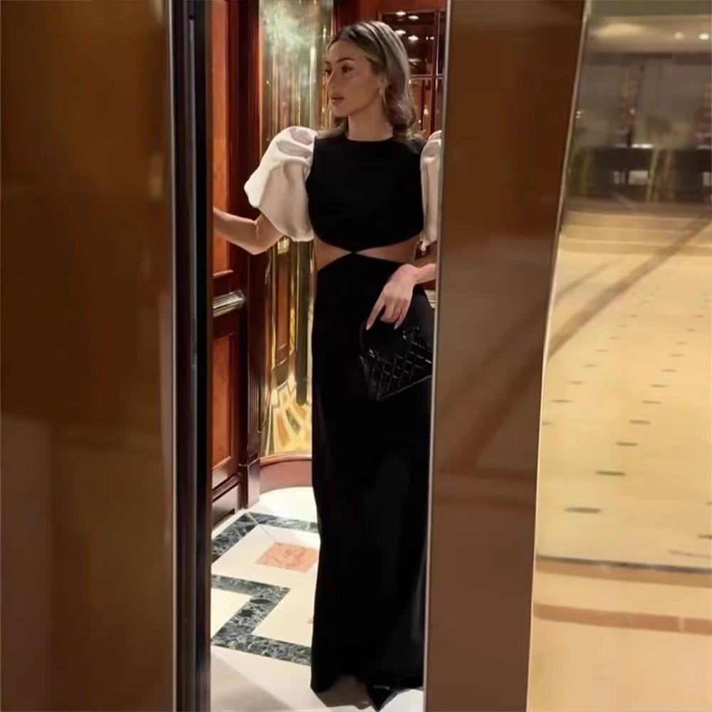 • Elegant Black And White Color Block Maxi Dress With White Puff Sleeves Cut Out Waist Round Neck Slim Fit Floor Length Evening Gown For Women Celebrity Party