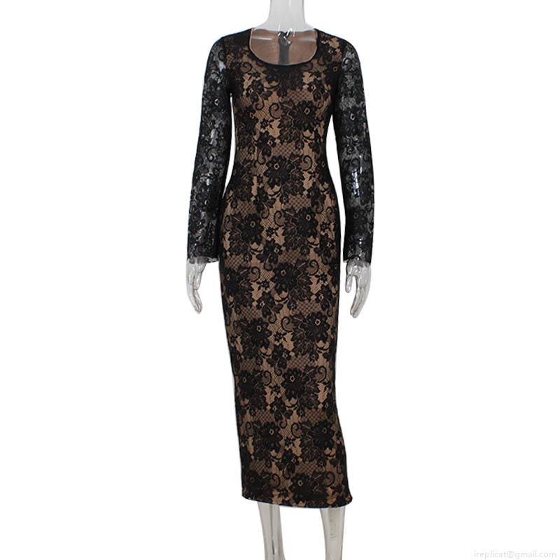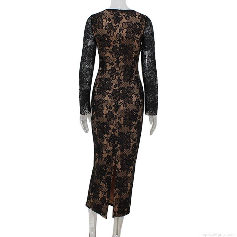 Elegant Black Floral Lace Long Sleeve Maxi Dress For Women Sexy Bodycon High Waist Slim Fit Evening Party Gown With Nude Lining Back Slit