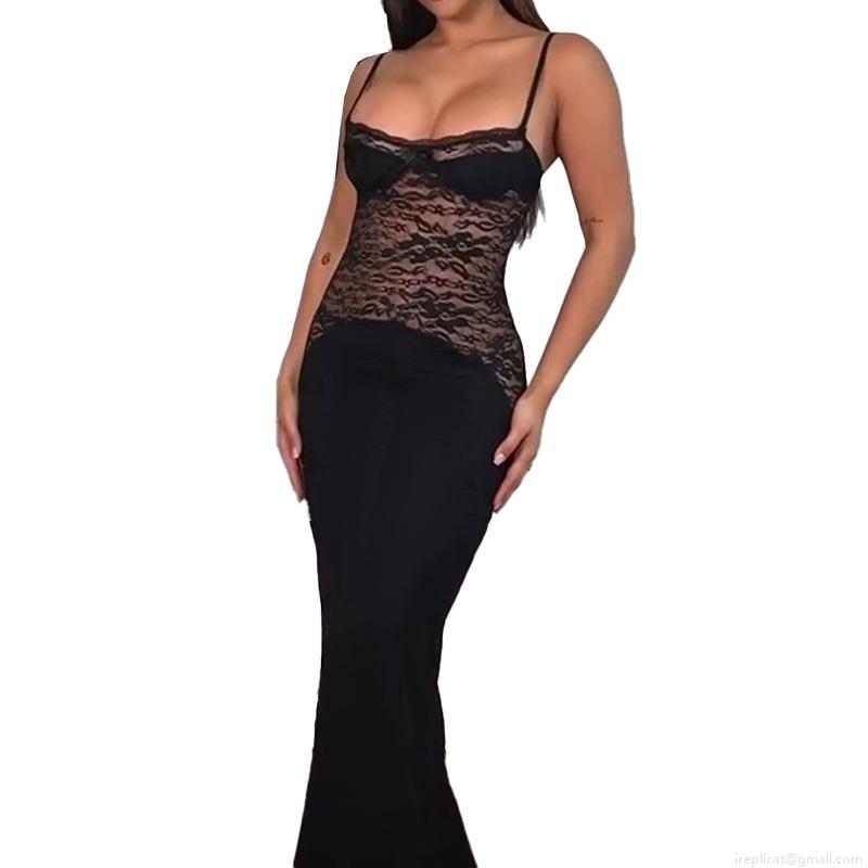 • Elegant Black Lace Patchwork Backless Maxi Dress Sexy Spaghetti Strap Bodycon Party Evening Dress For Women Summer Vacation Clubwear