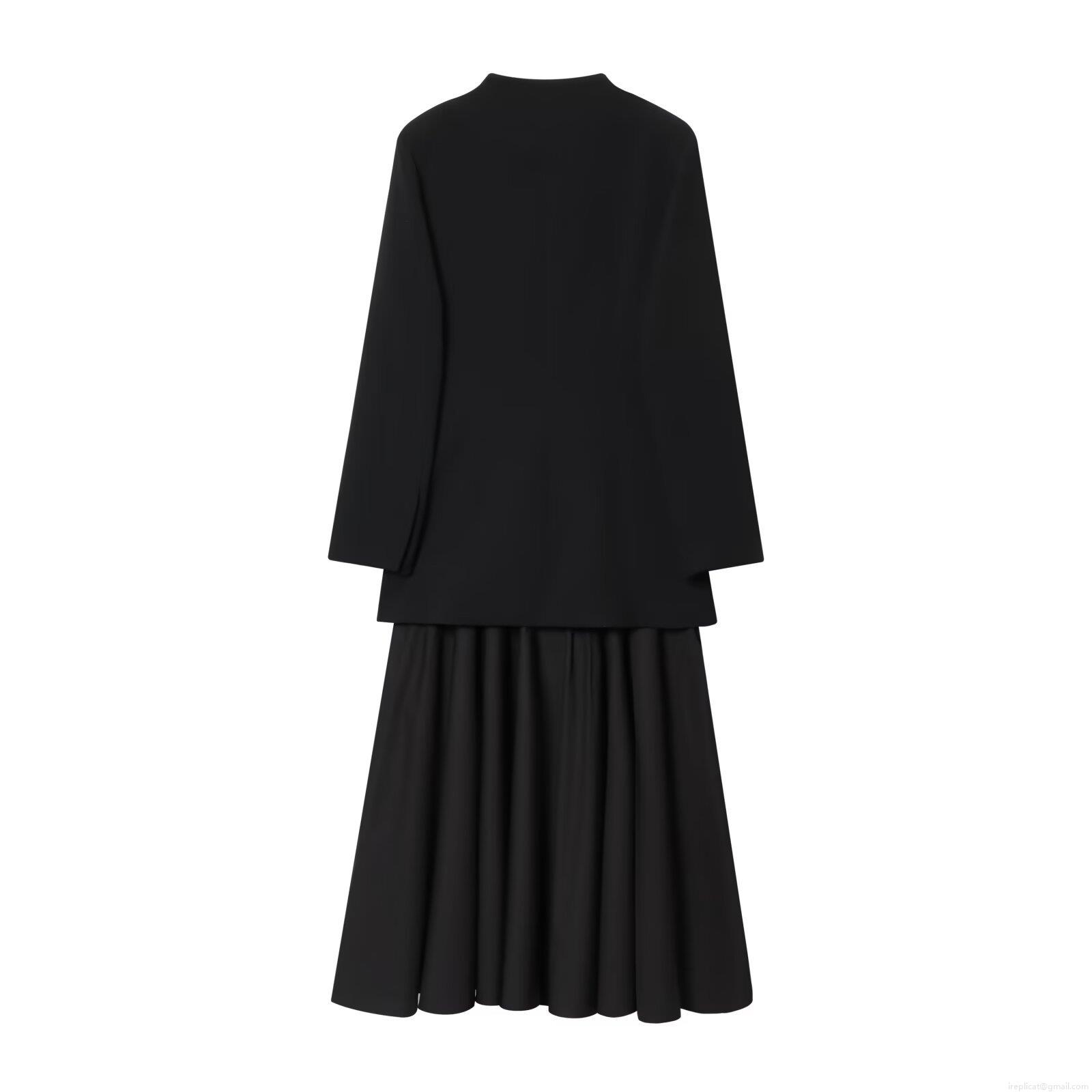• Elegant Black Long Sleeve Spliced Suit Dress For Women High Waist Pleated Maxi Skirts Office Lady Commuter Dress Solid Polyester Formal Party Wear