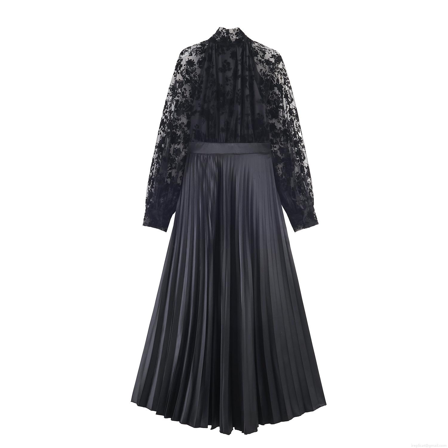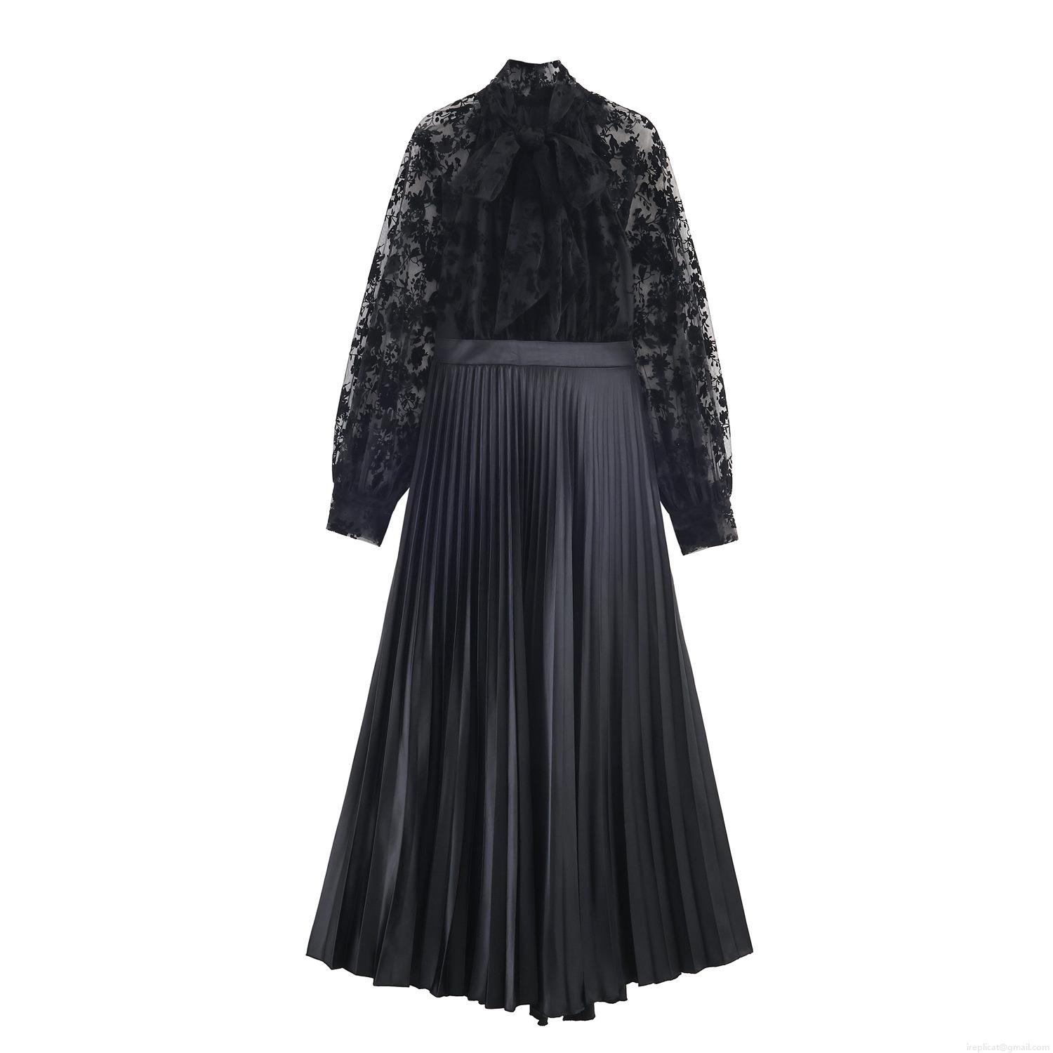 Elegant Black Mesh Flocking Patchwork Maxi Dress For Women Vintage Long Sleeve Bow Tie Neck High Waist Pleated Evening Party Long Dress