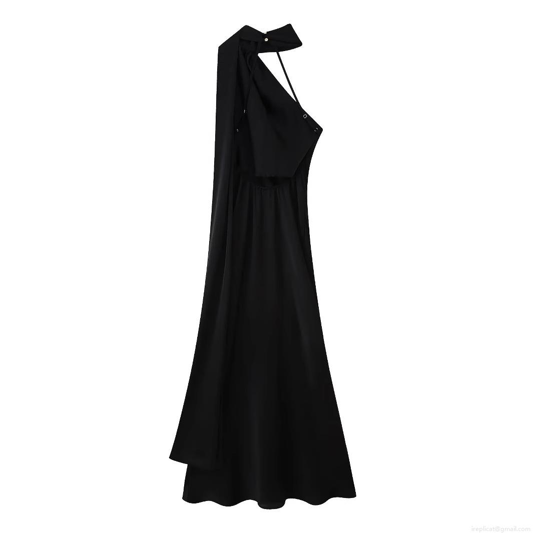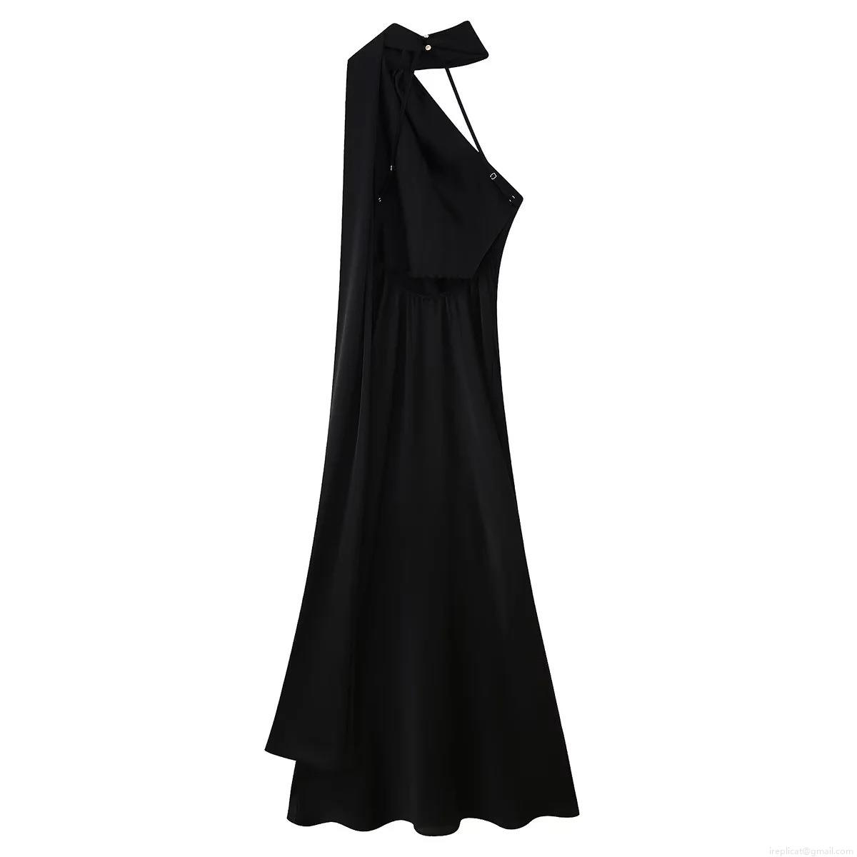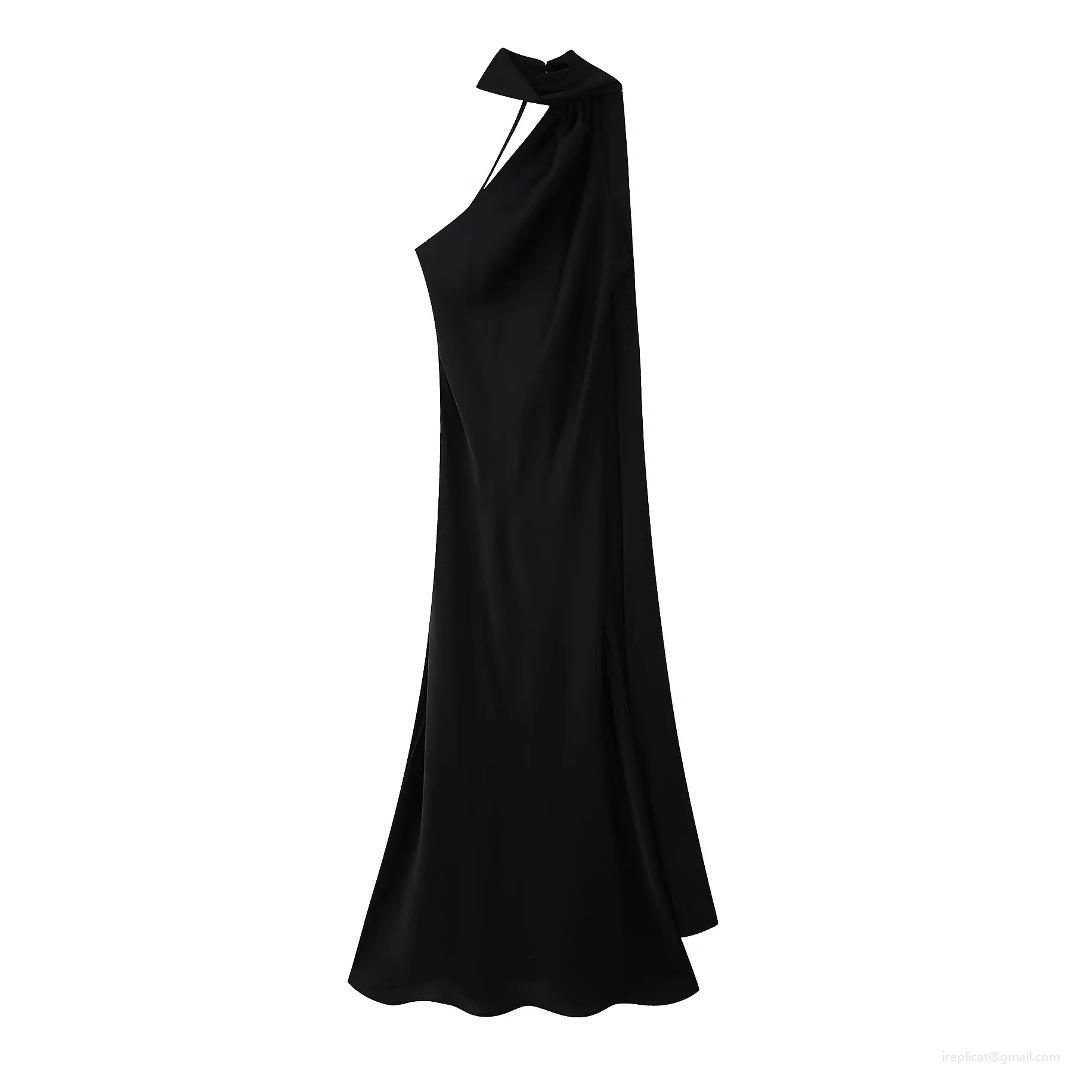 • Elegant Black Satin Halter One Shoulder Maxi Dress For Women Backless High Waist Irregular Floor Length Evening Party Banquet Prom Dress With Long Ribbon