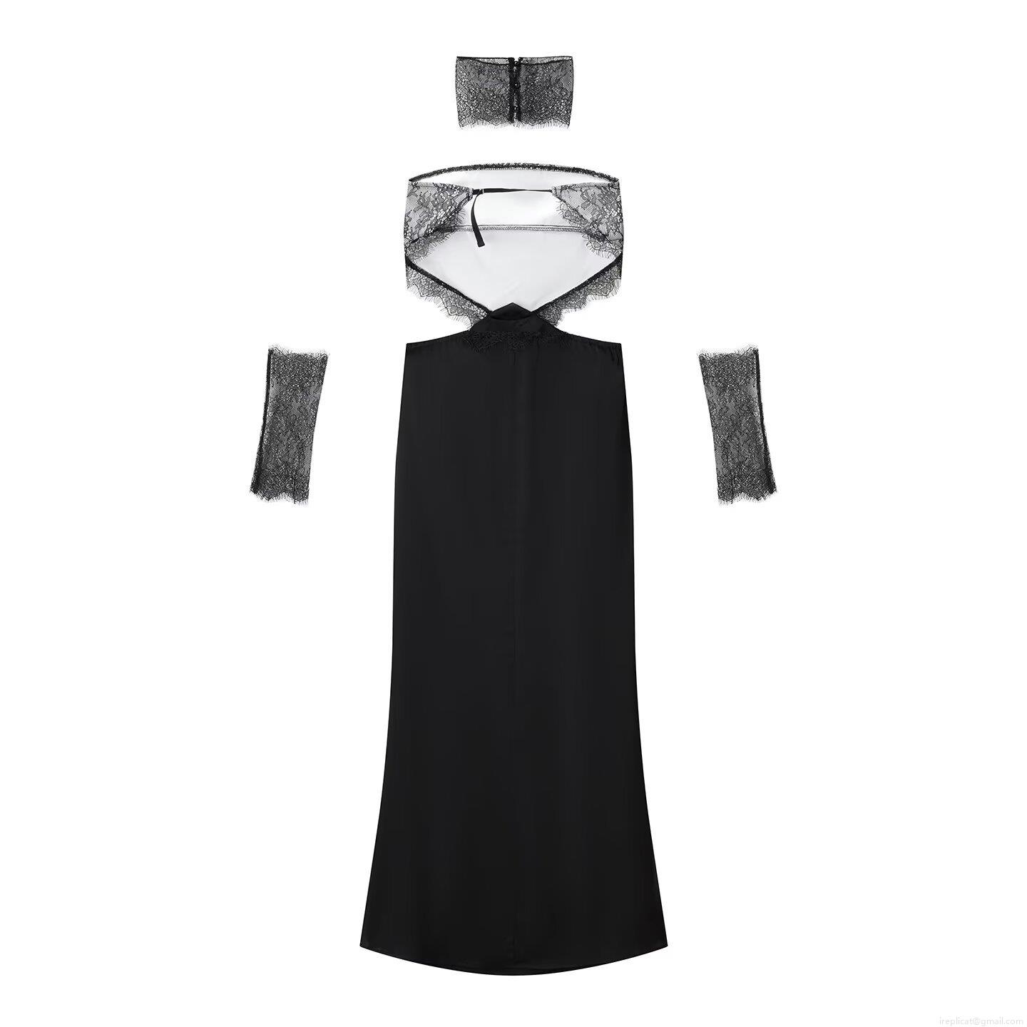 • Elegant Black Satin Lace Patchwork Maxi Dress 3-Piece Set With Choker And Sleeves Backless Sleeveless Evening Party Bodycon Dress For Women Wedding Guest Outfit