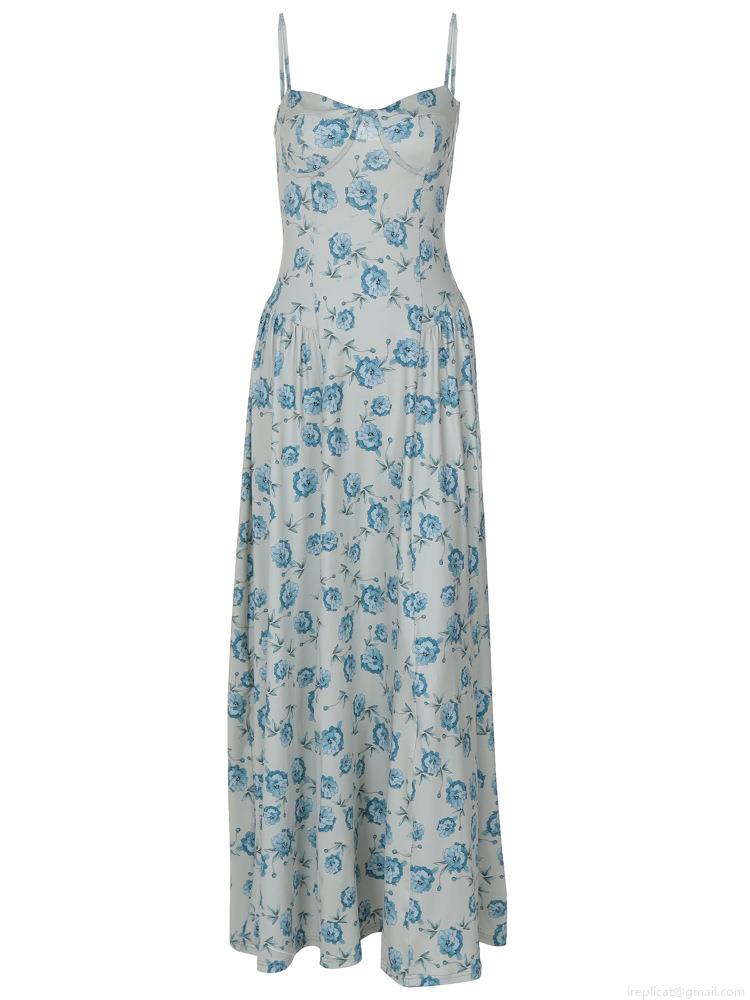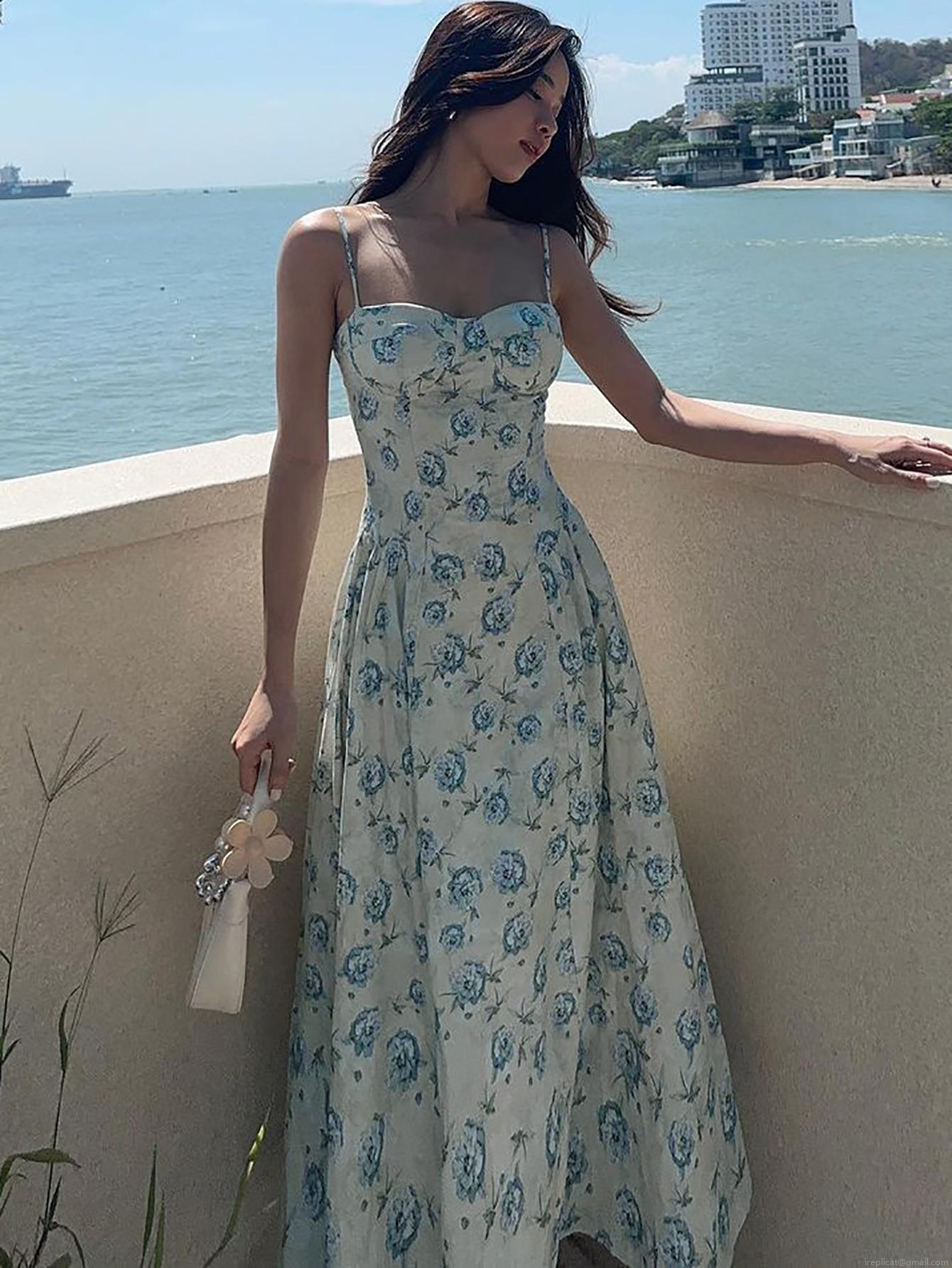 • Elegant Blue Floral Cami Maxi Dress For Women Sweet French V Neck High Stretch Bustier Slim Fit A-Line Summer Beach Vacation Long Dress