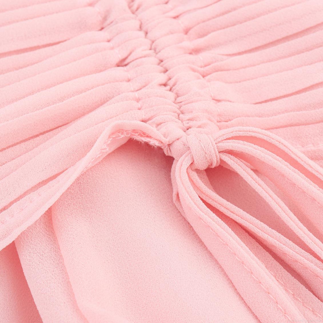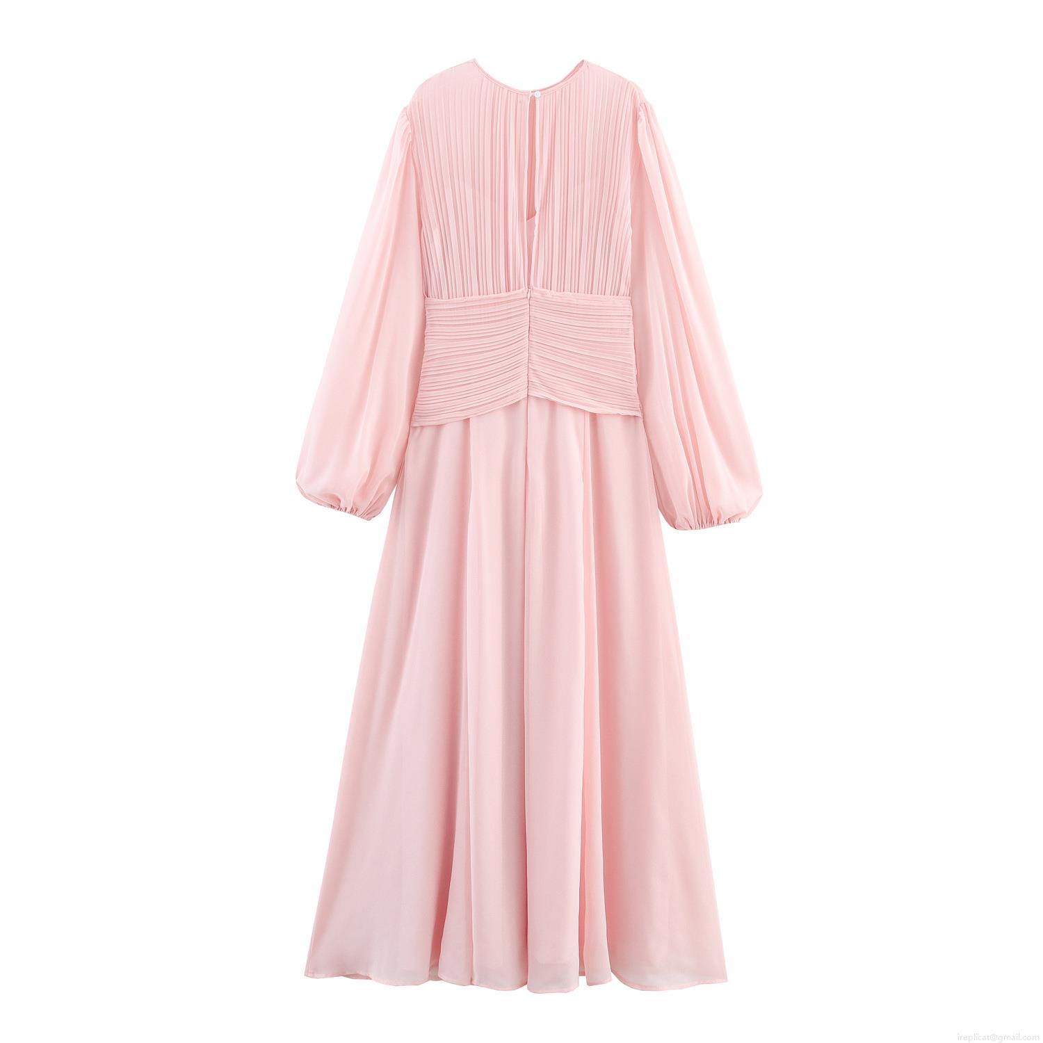 • Elegant Chiffon Maxi Dress For Women Pleated Design Lantern Sleeve Round Neck Solid Pink Long Dress For Commuter Office Party Lady