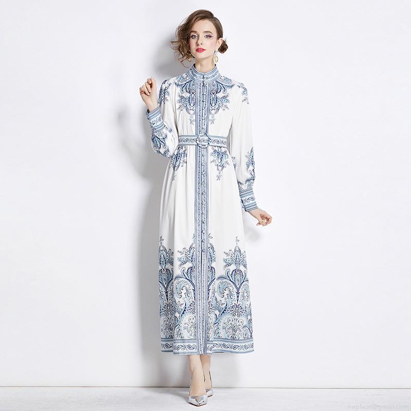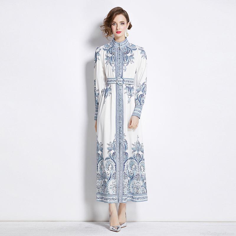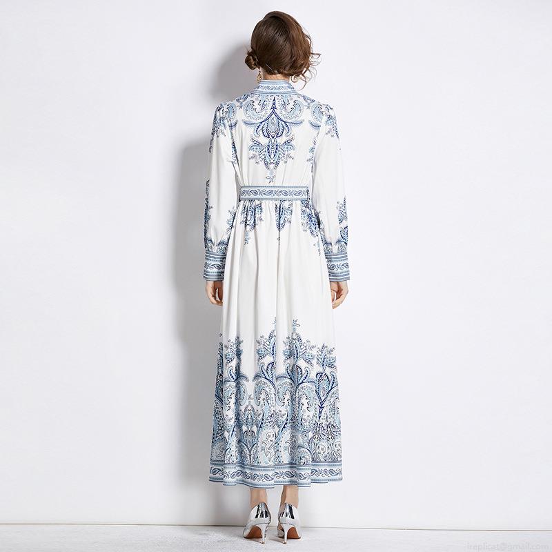 • Elegant Court Style Paisley Print Maxi Dress Polyester Chiffon Blend Stand Collar Single Breasted Puff Sleeve Long Sleeve With Belt Retro Bohemian Dress For Women Office Party Daily Fashion High Quality Long Gown