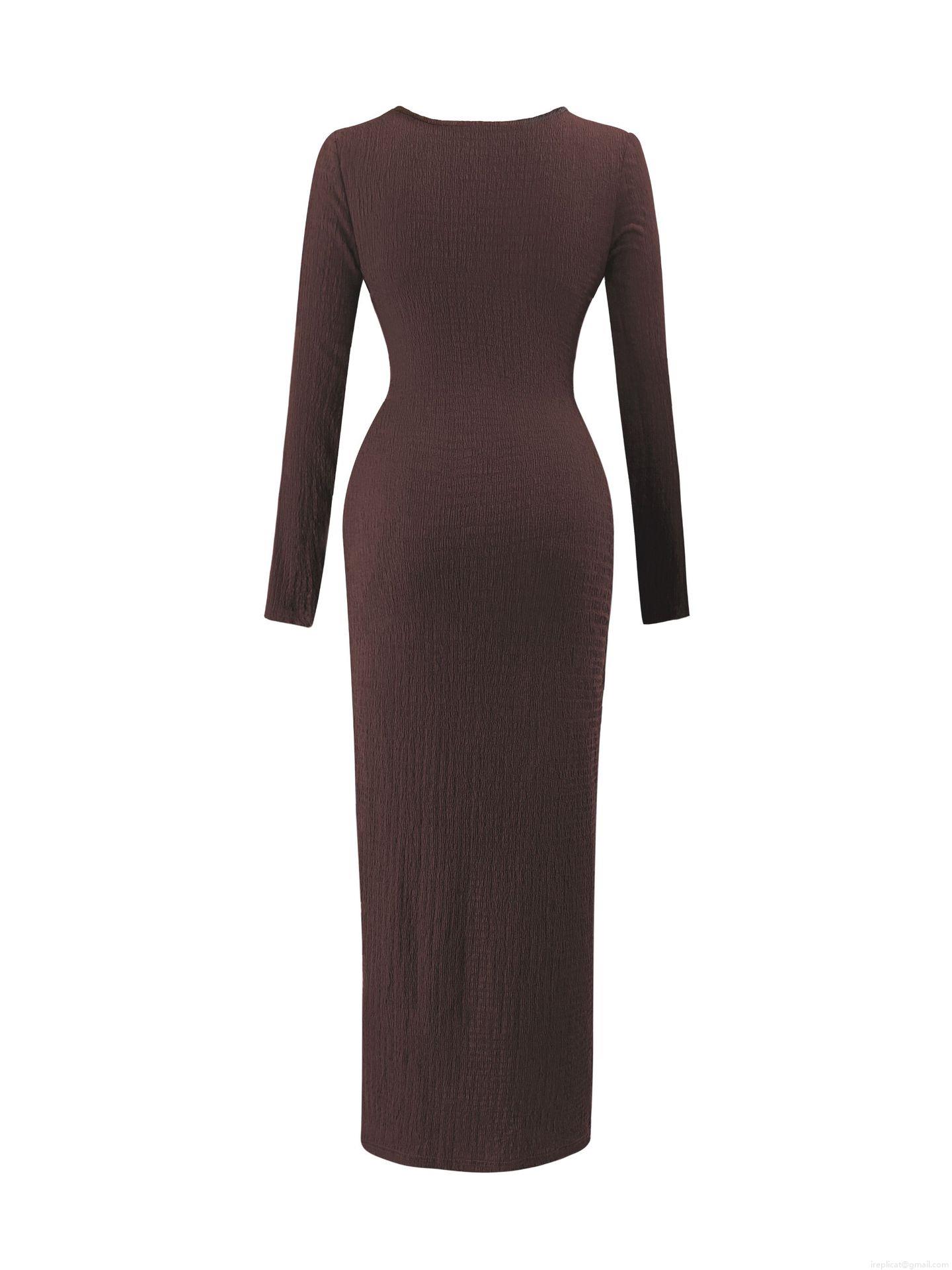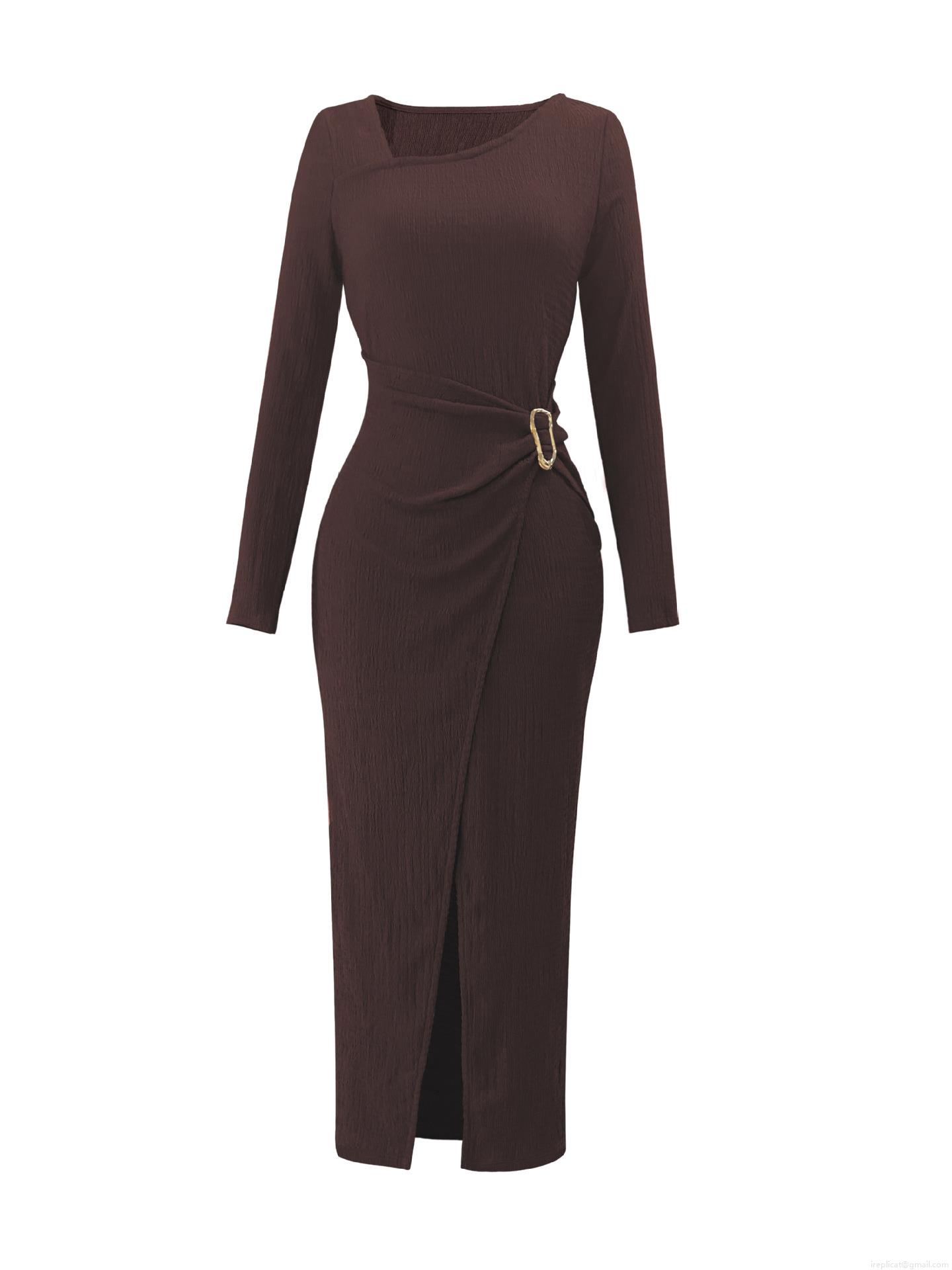 • Elegant Dark Brown Knit Maxi Dress With Metal Ring Side Slit Pleated Texture Long Sleeve Slim Fit Autumn Winter Women Fashion Long Dress